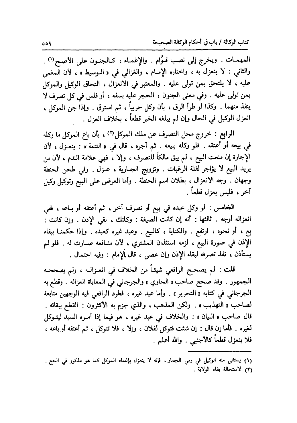 المهمات. ويخرج إلى نصب قوام. والاغماء، كالجنون على الاصح. والثاني: لا ينعزل به، واختاره الامام، والغزالي في الوسيط، لان المغمى عليه، لا يلتحق بمن تولى عليه. والمعتبر في الانعزال، التحاق الوكيل والموكل بمن تولى عليه. وفي معنى الجنون، الحجر عليه بسفه، أو فلس في كل تصرف لا ينفذ منهما. وكذا لو طرأ الرق، بأن وكل حربيا، ثم استرق. وإذا جن الموكل، انعزل الوكيل في الحال وإن لم يبلغه الخبر قطعا، بخلاف العزل. الرابع: خروج محل التصرف عن ملك الموكل، بأن باع (الموكل) ما وكله في بيعه أو أعتقه. فلو وكله ببيعه. ثم آجره، قال في التتمة: ينعزل، لان الاجارة إن منعت البيع، لم يبق مالكا للتصرف، وإلا، فهي علامة الندم، لان من يريد البيع لا يؤاجر لقلة الرغبات. وتزويج الجارية، عزل. وفي طحن الحنطة وجهان. وجه الانعزال، بطلان اسم الحنطة. وأما العرض على البيع وتوكيل وكيل آخر، فليس بعزل قطعا. الخامس: لو وكل عبده في بيع أو تصرف آخر، ثم أعتقه أو باعه، ففي انعزاله أوجه. ثالثها: أنه إن كانت الصيغة: وكلتك، بقي الاذن. وإن كانت: بع، أو نحوه، ارتفع. والكتابة، كالبيع. وعبد غيره كعبده. وإذا حكمنا ببقاء الاذن في صورة البيع، لزمه استئذان المشتري، لان منافعه صارت له. فلو لم يستأذن، نفذ تصرفه لبقاء الاذن وإن عصى، قال الامام: وفيه احتمال. قلت: لم يصحح الرافعي شيئا من الخلاف في انعزاله، ولم يصححه الجمهور. وقد صحح صاحب الحاوي والجرجاني في المعاياة انعزاله. وقطع به الجرجاني في كتابه التحرير. وأما عبد غيره، فطرد الرافعي فيه الوجهين متابعة لصاحب التهذيب. ولكن المذهب، والذي جزم به الاكثرون: القطع ببقائه. قال صاحب البيان: والخلاف في عبد غيره، هو فيما إذا أمره السيد ليتوكل لغيره. فأما إن قال: إن شئت فتوكل لفلان، وإلا، فلا تتوكل، ثم أعتقه أو باعه، فلا ينعزل قطعا كالاجنبي. والله أعلم.