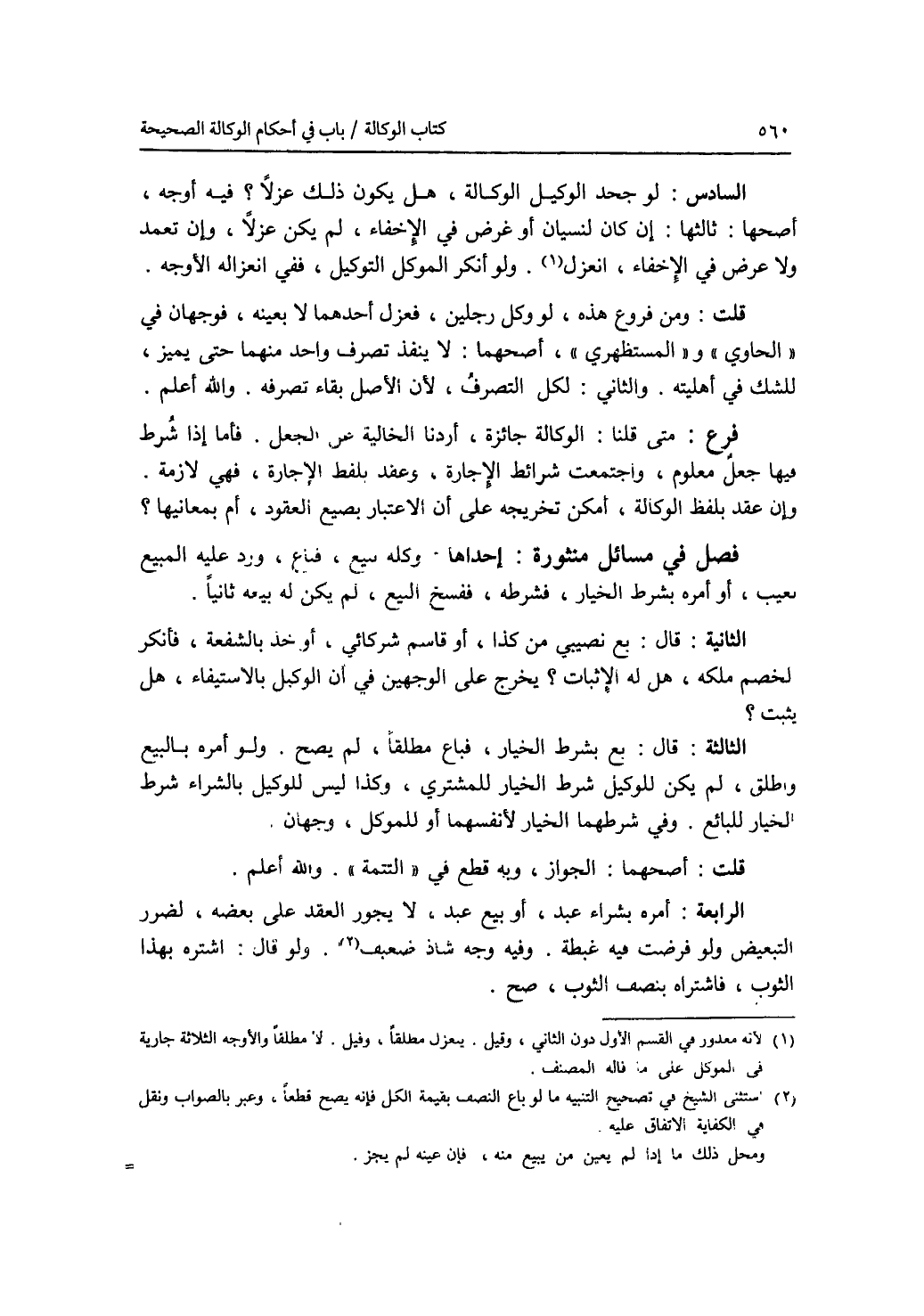 فصل في مسائل منثورة إحداها : وكله ببيع، فباع، ورد عليه المبيع بعيب، أو أمره بشرط الخيار، فشرطه، ففسخ البيع، لم يكن له بيعه ثانيا. الثانية: قال: بع نصيبي من كذا، أو قاسم شركائي، أو خذ بالشفعة، فأنكر الخصم ملكه، هل له الاثبات ؟ يخرج على الوجهين في أن الوكيل بالاستيفاء، هل يثبت ؟ الثالثة: قال: بع بشرط الخيار فباع مطلقا، لم يصح. ولو أمره بالبيع وأطلق، لم يكن للوكيل شرط الخيار للمشتري، وكذا ليس للوكيل بالشراء شرط الخيار للبائع. وفي شرطهما الخيالا نفسهما أو للموكل، وجهان. قلت: أصحهما: الجواز، وبه قطع في التتمة. والله أعلم. الرابعة: أمره بشراء عبد، أو بيع عبد، لا يجوز العقد على بعضه، لضرر التبعيض ولو فرضت فيه غبطة. وفيه وجه شاذ ضعيف. ولو قال: اشتره بهذا الثوب، فاشتراه بنصف الثوب، صح.
