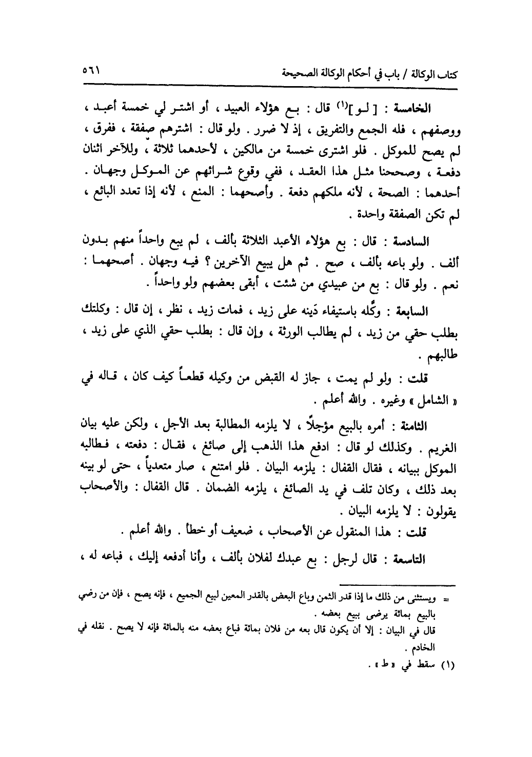 الخامسة: قال: بع هؤلاء العبيد، أو اشتر لي خمسة أعبد، ووصفهم، فله الجمع والتفريق، إذ لا ضرر. ولو قال: اشترهم صفقة، ففرق، لم يصح للموكل. فلو اشترى خمسة من مالكين، لاحدهما ثلاثة، وللآخر اثنان دفعة، وصححنا مثل هذا العقد، ففي وقوع شرائهم عن الموكل وجهان. أحدهما: الصحة، لانه ملكهم دفعة. وأصحهما: المنع، لانه إذا تعدد البائع، لم تكن الصفقة واحدة. السادسة: قال: بع هؤلاء الاعبد الثلاثة بألف، لم يبع واحدا منهم بدون ألف. ولو باعه بألف، صح. ثم هل يبيع الآخرين ؟ فيه وجهان. أصحهما نعم. ولو قال: بع من عبيدي من شئت، أبقى بعضهم ولو واحدا. السابعة: وكله باستيفاء دينه على زيد، فمات زيد، نظر، إن قال: وكلتك بطلب حقي من زبد، لم يطالب الورثة. وإن قال: بطلب حقي الذي على زيد، طالبهم. قلت: ولو لم يمت، جاز له القبض من وكيله قطعا كيف كان، قاله في الشامل وغيره. والله أعلم. الثامنة: أمره بالبيع مؤجلا، لا يلزمه المطالبة بعد الاجل، ولكن عليه بيان الغريم. وكذلك لو قال: ادفع هذا الذهب إلى صائغ، فقال: دفعته، فطالبه الموكل ببيانه، فقال القفال: يلزمه البيان. فلو امتنع، صار متعديا، حتى لو بينه بعد ذلك، وكان تلف في يد الصائغ، يلزمه الضمان. قال القفال: والاصحاب يقولون: لا يلزمه البيان. قلت: هذا المنقول عن الاصحاب، ضعيف أو خطأ. والله أعلم. التاسعة: قال لرجل: بع عبدك لفلان بألف، وأنا أدفعه إليك، فباعه له،