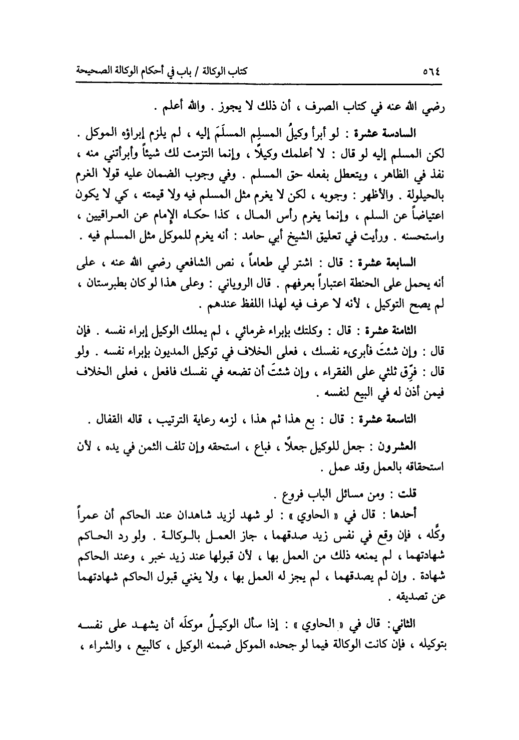 رضي الله عنه في كتاب الصرف، أن ذلك لا يجوز. والله أعلم. السادسة عشرة: لو أبرأ وكيل المسلم المسلم إليه، لم يلزم إبراؤه الموكل. لكن المسلم إليه لو قال: لا أعلمك وكيلا، وإنما التزمت لك شيئا وأبرأتني منه، نفذ في الظاهر، ويتعطل بفعله حق المسلم. وفي وجوب الضمان عليه قولا الغرم بالحيلولة. والاظهر: وجوبه، لكن لا يغرم مثل المسلم (فيه) ولا قيمته، كي لا يكون اعتياضا عن السلم، وإنما يغرم رأس المال، كذا حكاه الامام عن العراقيين، واستحسنه. ورأيت في تعليق الشيخ أبي حامد: أنه يغرم للموكل مثل المسلم فيه. السابعة عشرة: قال: اشتلي طعاما، نص الشافعي رضي الله عنه، على أنه يحمل على الحنطة اعتبارا بعرفه. قال الروياني: وعلى هذا لو كان بطبرستان، لم يصح التوكيل، لانه لاعرف فيلهذا اللفظ عندهم. الثامنة عشرة: قال: وكلتك بابراء غرمائي، لم يملك الوكيل إبراء نفسه. فإن قال: وإن شئت فأبرئ نفسك، فعلى الخلاف في توكيل المديون بإبراء نفسه. ولو قال: فرق ثلثي على الفقراء، وإن شئت أن تضعه في نفسك فافعل، فعلى الخلاف فيمن أذن له في البيع لنفسه. التاسعة عشرة: قال: بع هذا ثم هذا، لزمه رعاية الترتيب، قاله القفال. العشرون: جعل للوكيل جلا، فباع، استحقه وإن تلف الثمن في يده، لان استحقاقه بالعمل وقد عمل قلت: وممسائل الباب فروع. أحدها: قال في الحاوي: لو شهد لزيد شاهدان عند الحاكم أن عمرا وكله، فإن وقع في نفس زيد صدقهما، جاز العمل بالوكالة. ولو رد الحاكم شهادتهما، لم يمنعه ذلك من العمل بها، لان قبولها عند زيد خبر، وعند الحاكم شهادة. وإن لم يصدقهما، لم يجز (له) العمل بها، ولا يغني قبول الحاكم شهادتهما عن تصديقه. الثاني: قال في الحاوي: إذا سأل الوكيل موكله أن يشهد على نفسه بتوكيله، فإن كانت الوكالة فيما لو جحده الموكل ضمنه الوكيل، كالبيع، والشراء،