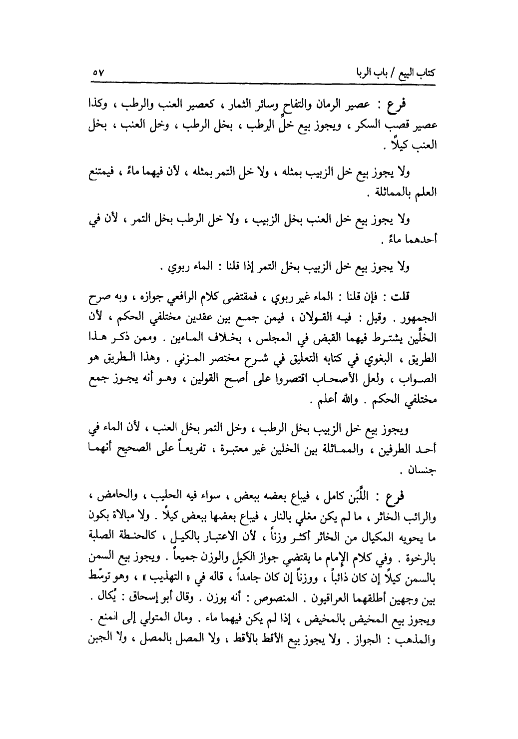 فرع عصير الرمان والتفاح وسائر الثمار، كعصير العنب والرطب، وكذا عصير قصب السكر. ويجوز بيع خل الرطب، بخل الرطب، وخل العنب، بخل العنب كيلا. ولا يجوز بيع خل الزبيب بمثله، ولا خل التمر بمثله، لان فيهما ماء، فيمتنع العلم بالمماثلة. ولا يجوز بيع خل العنب بخل الزبيب، ولاخل الرطب بخل التمر، لان في أحدهما ماء. ولا يجوز بيع خل الزبيب بخل التمر إذا قلنا: الماء ربوي. قلت: فإن قلنا: الماء غير ربوي، فمقتضى كلام الرافعي جوازه، وبه صرح الجمهور. وقيل: فيه القولان، فيمن جمع بين عقدين مختلفي الحكم، لان الخلين يشترط فيهما القبض في المجلس، بخلاف الماءين. وممن ذكر ذا الطريق، البغوي في كتابه التعليق في شرح مختصر المزني. وهذا الطريق هو الصواب، ولعل الاصحاب اقتصروا على أصح القولين، وهو أنه يجوز جمع مختلفي الحكم. والله أعلم. ويجوز بيع خل الزبيب بخل الرطب، وخل التمر بخل العنب، لان الماء في أحد الطرفين، والمماثلة بين الخلين غير معتبرة، تفريعا على الصحيح أنهما جنسان. فرع اللبن كامل، فيباع بعضه ببعض، سواء فيه الحليب، والحامض، والرائب الخاثر، ما لم يكن مغلي بالنار، فيباع بعضها ببعض كيلا. ولا مبالاة بكون ما يحويه المكيال من الخاثر أكثر وزنا، لان الاعتبار بالكيل، كالحنطة الصلبة بالرخوة. وفي كلام الامام ما يقتضي جواز الكيل والوزن جميعا. ويجوز بيع السمن بالسمن كيلا إن كان ذائبا، ووزنا إن كان جامدا، قاله في التهذيب، وهو توسط بين وجهين أطلقهما العراقيون. المنصوص: أنه يوزن. وقال أبو إسحق: يكال. ويجوز بيع المخيض بالمخيض، إذا لم يكن فيهما ماء. ومال المتولي إلى المنع. والمذهب: الجواز. ولا يجوز بيع الاقط بالاقط، ولا المصل بالمصل، ولا الجبن