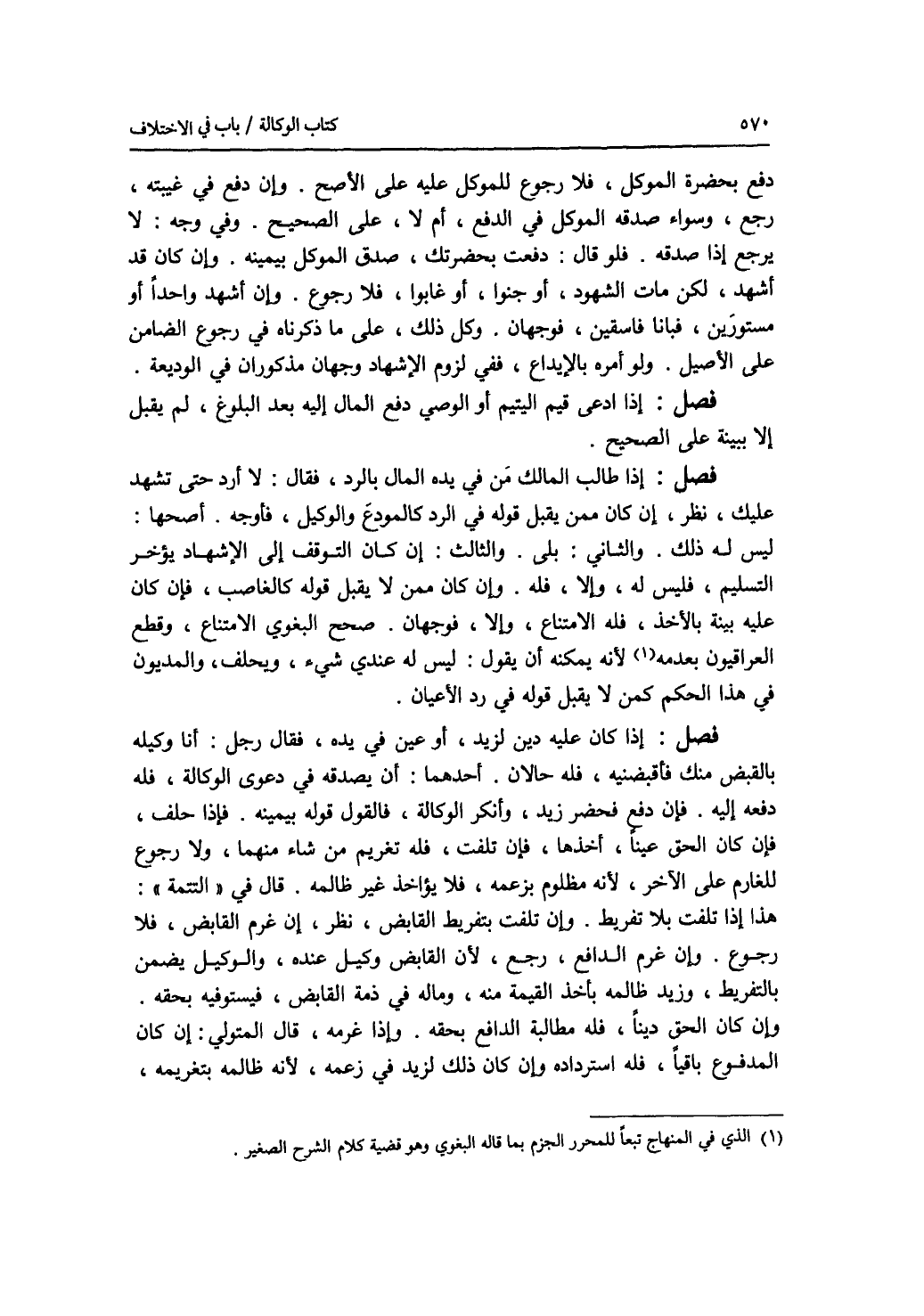 فصل إذا ادعى قيم اليتيم أو الوصي دفع المال إليه بعد البلوغ، لم يقبل إلا ببينة على الصحيح. فصل إذا طالب المالك من في يده المال بالرد، فقال: لا أرد حتى تشهد عليك، نظر، إن كان ممن يقبل قوله في الرد كالمودع والوكيل، فأوجه. أصحها: ليس له ذلك. والثاني: بلى. والثالث: إن كان التوقف إلى الاشهاد يؤخر التسليم، فليس له، وإلا، فله. وإن كان ممن لا يقبل قوله كالغاصب، فإن كان عليه بينة بالاخذ، فله الامتناع، وإلا، فوجهان. صحح البغوي الامتناع، وقطع العراقيون بعدمه، لانه يمكنه أن يقول: ليس له عندي شئ، ويحلف، والمديون في هذا الحكم كمن لا يقبل قوله في رد الاعيان.