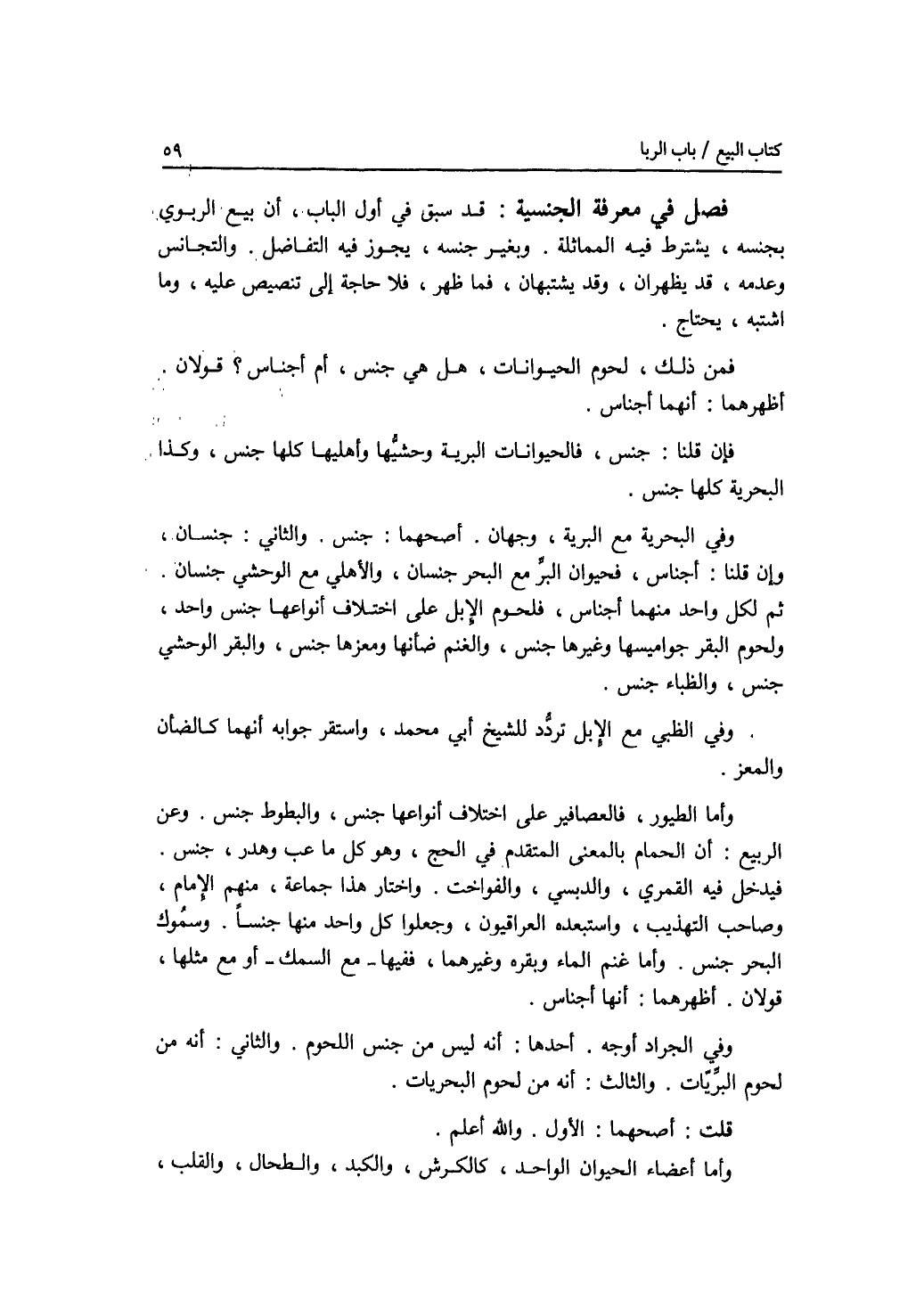 فصل في معرفة الجنسية قد سبق في أول الباب، أن بيع الربوي بجنسه، يشترط فيه المماثلة. وبغير جنسه، يجوز فيه التفاضل. والتجانس وعدمه، قد يظهران، وقد يشتبهان، فما ظهر، فلا حاجة إلى تنصيص عليه، وما اشتبه، يحتاج. فمن ذلك، لحوم الحيوانات، هل هي جنس، أم أجناس ؟ قولان. أظهرهما: أنهما أجناس. فإن قلنا: جنس، فالحيوانات البرية وحشيها وأهليها كلها جنس، وكذا البحرية كلها جنس. وفي البحرية مع البرية، وجهان. أصحهما: جنس. والثاني: جنسان. وإن قلنا: أجناس، فحيوان البر مع البحر جنسان، والاهلي مع الوحشي جنسان. ثم لكل واحد منهما أجناس، فلحوم الابل على اختلاف أنواعها جنس واحد، ولحوم البقر جواميسها وغيرها جنس، والغنم ضأنها ومعزها جنس، والبقر الوحشي جنس، والظباء جنس. وفي الظبي مع الابل تردد للشيخ أبي محمد، واستقر جوابه أنهما كالضأن والمعز. وأما الطيور، فالعصافير على اختلاف أنواعها جنس، والبطوط جنس. وعن الربيع: أن الحمام بالمعنى المتقدم في الحج، وهو كل ما عب وهدر، جنس. فيدخل فيه القمري، والدبسي، والفواخت. واختار هذا جماعة، منهم الامام، وصاحب التهذيب، واستبعده العراقيون، وجعلوا كل واحد منها جنسا. وسموك البحر جنس. وأما غنم الماء وبقره وغيرهما، ففيها - مع السمك - أو مع مثلها، قولان. أظهرهما: أنها أجناس. وفي الجراد أوجه. أحدها: أنه ليس من جنس اللحوم. والثاني: أنه من لحوم البريات. والثالث: أنه من لحوم البحريات. قلت: أصحهما: الاول. والله أعلم. وأما أعضاء الحيوان الواحد، كالكرش، والكبد، والطحال، والقلب،