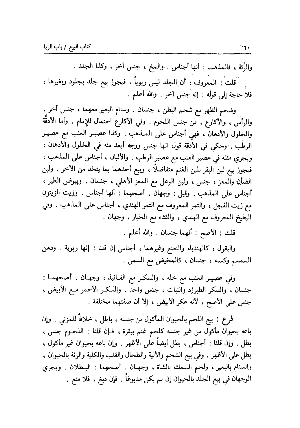 والرئة، فالمذهب: أنها أجناس. والمخ، جنس آخر، وكذا الجلد. قلت: المعروف، أن الجلد ليس ربويا، فيجوز بيع جلد بجلود وبغيرها، فلا حاجة إلى قوله: إنه جنس آخر. والله أعلم. وشحم الظهر مع شحم البطن، جنسان. وسنام البعير معهما، جنس آخر. والرأس، والاكارع، من جنس اللحوم. وفي الاكارع احتمال للامام. وأما الادقة والخلول والادهان، فهي أجناس على المذهب. وكذا عصير العنب مع عصير الرطب. وحكي في الادقة قول أنها جنس، ووجه أبعد منه في الخلول والادهان، ويجري مثله في عصبر العنب مع عصير الرطب. والالبان، أجناس على المذهب، فيجوز بيع لبن البقر بلبن الغنم متفاضلا، وبيع أحدهما بما يتخد من الآخر. ولبن الضأن والمعز، جنس، ولبن الوعل مع المعز الاهلي، جنسان. وبيوض الطير، أجناس على المذهب. وقيل: وجهان. أصحهما: أنها أجناس. وزيت الزيتون مع زيت الفجل، والتمر المعروف مع التمر الهندي، أجناس على المذهب. وفي ا لبطيخ المعروف مع الهندي، والقثار مع الخيار، وجهان. قلت: الاصح: أنهما جنسان. والله أعلم. والبقول، كالهندبا والنعنع وغيرهما، أجناس إن قلنا: إنها ربوية. ودهن السمسم وكسبه، جنسان، كالمخيص مع السمن. وفي عصير العنب مع خله، والسكر مع الفانيذ، وجهان. أصحهما: جنسان. والسكر الطبرزد والنبات، جنس واحد. والسكر الاحمر مع الابيض، جنس على الاصح، لانه عكر الابيض، ألا أن صفتهما مختلفة. فرع بيع اللحم بالحيوان المأكول من جنسه، باطل، خلافا للمزني. وإن باعه بحيوان مأكول من غير جنسه كلحم غنم ببقرة، فإن قلنا: اللحوم جنس، بطل. وإن قلنا: أجناس، بطل أيضا على الاظهر. وإن باعه بحيوان غير مأكول، بطل على الاظهر. وفي بيع الشحم والالية والطحال والقلب والكلية والرئة بالحيوان، والسنام بالبعير، ولحم السمك بالشاة، وجهان. أصحهما: البطلان. ويجري الوجهان في بيع الجلد بالحيوان إن لم يكن مدبوغا. فإن دبغ فلا منع.