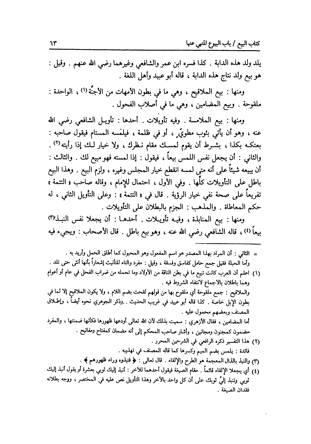 يلد ولد هذه الدابة. كذا فسره ابن عمر والشافعي وغيرهما رضي الله عنهم. وقيل: هو بيع ولد نتاج هذه الدابة، قاله أبو عبيد وأهل اللغة. ومنها: بيع الملاقيح، وهي ما في بطون الامهات من الاجنة، الواحدة: ملقوحة. وبيع المضامين، وهي ما في أصلاب الفحول. ومنها: بيع الملامسة. وفيه تأويلات. أحدها: تأويل الشافعي رضي الله عنه، وهو أن يأتي بثوب مطوي، أو في ظلمة، فيلمسه المستام فيقول صاحبه: بعتكه بكذا، بشرط أن يقوم لمسك مقام نظرك، ولا خيار لك إذا رأيته. والثاني: أن يجعل نفس اللمس بيعا، فيقول: إذا لمسته فهو مبيع لك. والثالث: أن يبيعه شيئا على أنه متى لمسه انقطع خيار المجلس وغيره، ولزم البيع. وهذا البيع باطل على التأويلات كلها. وفي الاول، احتمال للامام، وقاله صاحب التتمة تفريعا على صحة نفي خيار الرؤية. قال في التتمة: وعلى التأويل الثاني، له حكم المعاطاة. والمذهب: الجزم بالبطلان على التأويلات. ومنها: بيع المنابذة، وفيه تأويلات. أحدها: أن يجعلا نفس النبذ بيعا، قاله الشافعي رضي الله عنه، وهو بيع باطل. قال الاصحاب: ويجئ فيه