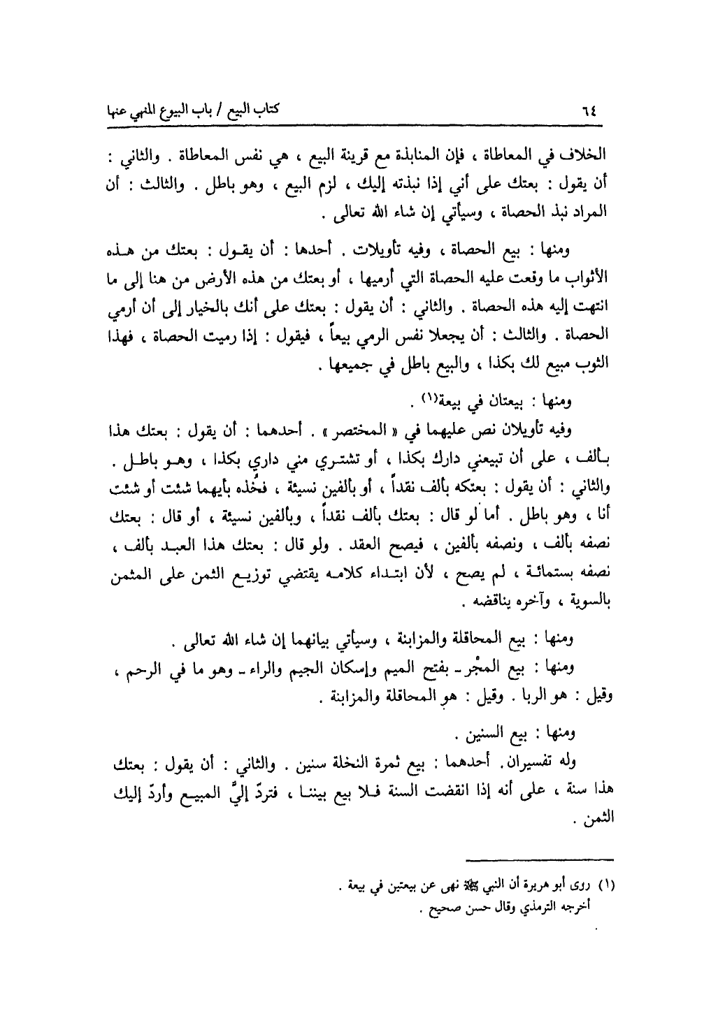 الخلاف في المعاطاة، فإن المنابذة مع قرينة البيع، هي نفس المعاطاة. والثاني: أن يقول: بعتك على أني إذا نبذته إليك، لزم البيع، وهو باطل. والثالث: أن المراد نبذ الحصاة، وسيأتي إن شاء الله تعالى. ومنها: بيع الحصاة، وفيه تأويلات. أحدها: أن يقول: بعتك من هذه الاثواب ما وقعت عليه الحصاة التي أرميها، أو بعتك من هذه الارض من هنا إلى ما انتهت إليه هذه الحصاة. والثاني: أن يقول: بعتك على أنك بالخيار إلى أن أرمي الحصاة. والثالث: أن يجعلا نفس الرمي بيعا، فيقول: إذا رميت الحصاة، فهذا الثوب مبيع لك بكذا، والبيع باطل في جميعها. ومنها: بيعتان في بيعة، وفيه تأويلان نص عليهما في المختصر. أحدهما: أن يقول: بعتك هذا بألف، على أن تبيعني دارك بكذا، أو تشتري مني داري بكذا، وهو باطل. والثاني: أن يقول: بعتكه بألف نقدا، أو بألفين نسيئة، فخذه بأيهما شئت أو شئت أنا، وهو باطل. أما لو قال: بعتك بألف نقدا، وبألفين نسيئة، أو قال: بعتك نصفه بألف، ونصفه بألفين، فيصح العقد. ولو قال: بعتك هذا العبد بألف، نصفه بستمائة، لم يصح، لان ابتداء كلامه يقتضي توزيع الثمن على المثمن بالسوية، وآخره يناقضه. ومنها: بيع المحاقلة والمزابنة، وسيأتي بيانهما أن شاء الله تعالى. ومنها: بيع المجر - بفتح الميم وإسكان الجيم والراء - وهو ما في الرحم، وقيل: هو الربا. وقيل: هو المحاقلة والمزابنة. ومنها: بيع السنين، وله تفسيران. أحدهما: بيع ثمرة النخلة سنين. والثاني: أن يقول: بعتك هذا سنة، على أنه إذا انقضت السنة فلا بيع بيننا، فترد إلي المبيع وأرد إليك الثمن.