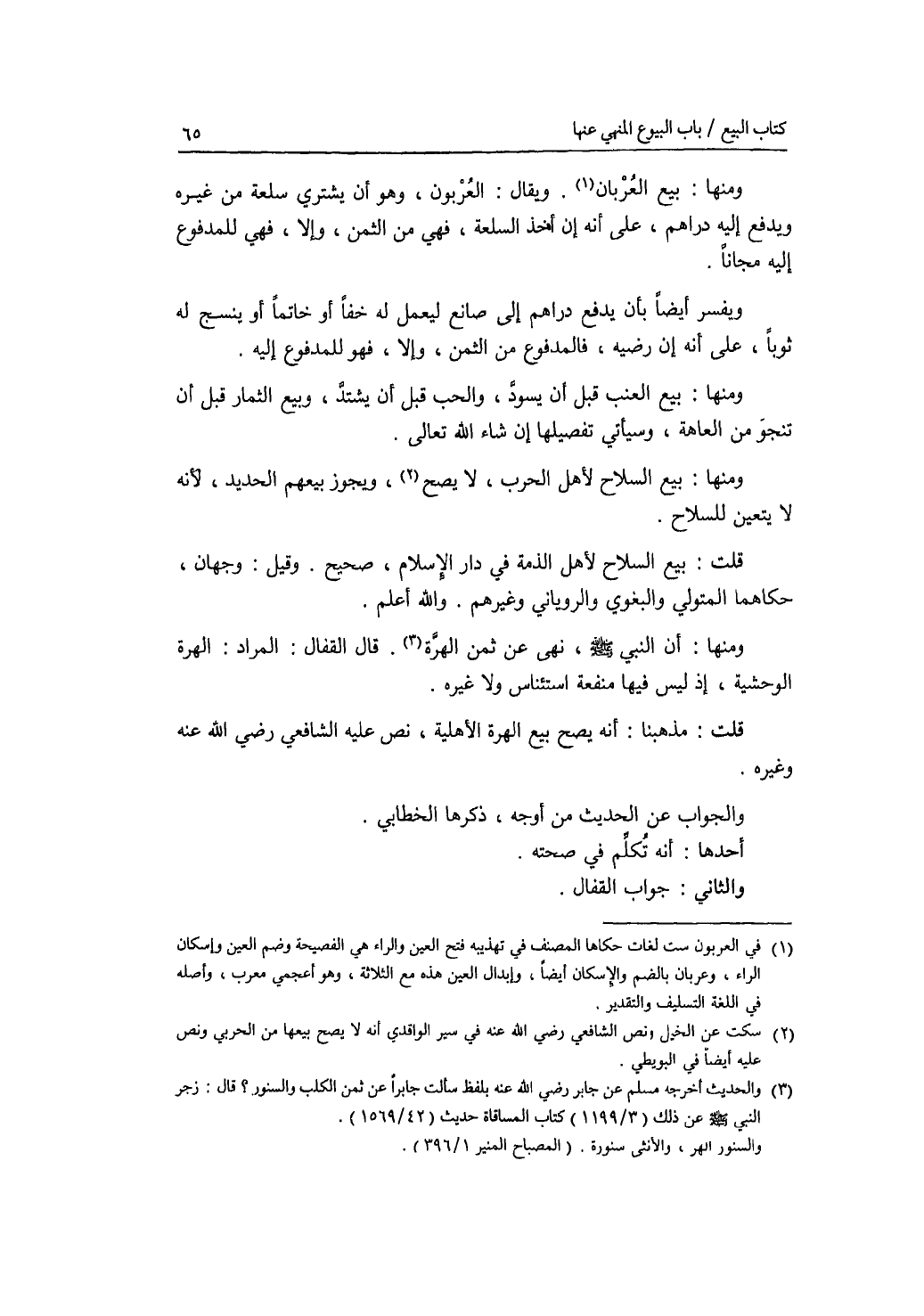 ومنها: بيع العربان. ويقال: العربون، وهو أن يشتري سلعة من غيره ويدفع إليه دراهم، على أنه إن أخذ السلعة، فهي من الثمن، وإلا، فهي للمدفوع إليه مجانا. ويفسر أيضا بأن يدفع دراهم إلى صانع ليعمل له خفا أو خاتما أو ينسج له ثوبا، على أنه إن رضيه، فالمدفوع من الثمن، وإلا، فهو للمدفوع إليه. ومنها: بيع العنب قبل أن يسود، والحب قبل أن يشتد، وبيع الثمار قبل أن تنجو من العاهة، وسيأتي تفصيلها إن شاء الله تعالى. ومنها: بيع السلاح لاهل الحرب، لا يصح، ويجوز بيعهم الحديد، لانه لا يتعين للسلاح. قلت: بيع السلاح لاهل الذمة في دار الاسلام، صحيح. وقيل: وجهان، حكاهما المتولي والبغوي والروياني وغيرهم. والله أعلم. ومنها: أن النبي - صلى الله عليه وسلم -، نهى عن ثمن الهرة. قال القفال: المراد: الهرة الوحشية، إذ ليس فيها منفعة استئناس ولا غيره. قلت: مذهبنا: أنه يصح بيع الهرة الاهلية، نص عليه الشافعي رضي الله عنه وغيره. والجواب عن الحديث من أوجه، ذكرها الخطابي. أحدها: أنه تكلم في صحته. والثاني: جواب القفال.