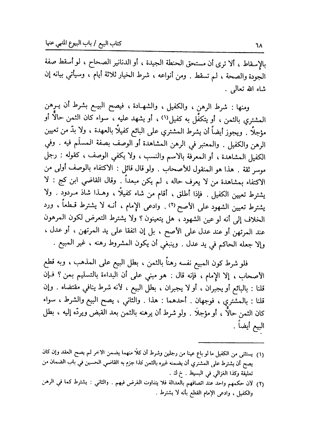 بالاسقاط، ألا ترى أن مستحق الحنطة الجيدة، أو الدنانير الصحاح، لو أسقط صفة الجودة والصحة، لم تسقط. ومن أنواعه، شرط الخيار ثلاثة أيام، وسيأتي بيانه إن شاء الله تعالى. ومنها: شرط الرهن، والكفيل، والشهادة، فيصح البيع بشرط أن يرهن المشتري بالثمن، أو يتكفل به كفيل، أو يشهد عليه، سواء كان الثمن حالا أو مؤجلا. ويجوز أيضا أن يشرط المشتري على البائع كفيلا بالعهدة، ولا بد من تعبين الرهن والكفيل. والمعتبر في الرهن المشاهدة أو الوصف بصفة المسلم فيه. وفي الكفيل المشاهدة، أو المعرفة بالاسم والنسب، ولا يكفي الوصف، كقوله: رجل موسر ثقة. هذا هو المنقول للاصحاب. ولو قال قائل: الاكتفاء بالوصف أولى من الاكتفاء بمشاهدة من لا يعرف حاله، لم يكن مبعدا. وقال القاضي ابن كج: لا يشترط تعيين الكفيل. فإذا أطلق، أقام من شاء كفيلا، وهذا شاذ مردود. ولا يشترط تعيين الشهود على الاصح. وادعى الامام، أنه لا يشترط قطعا، ورد الخلاف إلى أنه لو عين الشهود، هل يتعينون ؟ ولا يشترط التعرض لكون المرهون عند المرتهن أو عند عدل على الاصح، بل إن اتفقا على يد المرتهن، أو عدل، وإلا جعله الحاكم في يد عدل. وينبغي أن يكون المشروط رهنه، غير المبيع. فلو شرط كون المبيع نفسه رهنا بالثمن، بطل البيع على المذهب، وبه قطع الاصحاب، إلا الامام، فإنه قال: هو مبني على أن البداءة بالتسليم بمن ؟ فإن قلنا: بالبائع أو يجبران، أو لا يجبران، بطل البيع، لانه شرط ينافي مقتضاه. وإن قلنا: بالمشتري، فوجهان. أحدهما: هذا. والثاني: يصح البيع والشرط، سواء كان الثمن حالا، أو مؤجلا. ولو شرط أن يرهنه بالثمن بعد القبض ويرده إليه، بطل البيع أيضا.