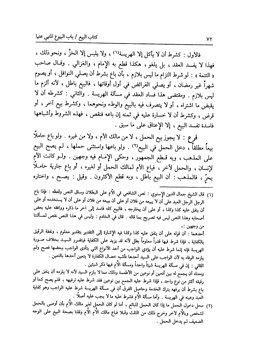 فالاول: كشرط أن لا يأكل إلا الهريسة، ولا يلبس إلا الخز، ونحو ذلك، فهذا لا يفسد العقد، بل يلغو، هكذا قطع به الامام، والغزالي. وقال صاحب التتمة: لو شرط التزام ما ليس بلازم، بأن باع بشرط أن يصلي النوافل، أو يصوم شهرا غير رمضان، أو يصلي الفرائض في أول أوقاتها، فالبيع باطل، لانه ألزم ما ليس بلازم. ومقتضى هذا فساد العقد في مسألة الهريسة. والثاني: كشرطه أن لا يقبض ما اشتراه، أو لا يتصرف فيه بالبيع والوطئ ونحوهما، وكشرط بيع أخر، أو قرض، وكشرط أن لا خسارة عليه في ثمنه إن باعه فنقص، فهذه الشروط وأشباهها فاسدة تفسد البيع، إلا الاعتاق على ما سبق. فرع لا يجوز بيع الحمل، لا من مالك الام، ولا من غيره. ولو باع حاملا بيعا مطلقا، دخل الحمل في البيع. ولو باعها واستثنى حملها، لم يصح البيع على المذهب، وبه قطع الجمهور، وحكى الامام فيه وجهين. ولو كانت الام لانسان، والحمل لآخر، فباع الام لمالك الحمل أو لغيره، أو باع جارية حاملا بحر، فالمذهب: أن البيع باطل، وبه قطع الاكثرون. وقيل: يصح، واختاره