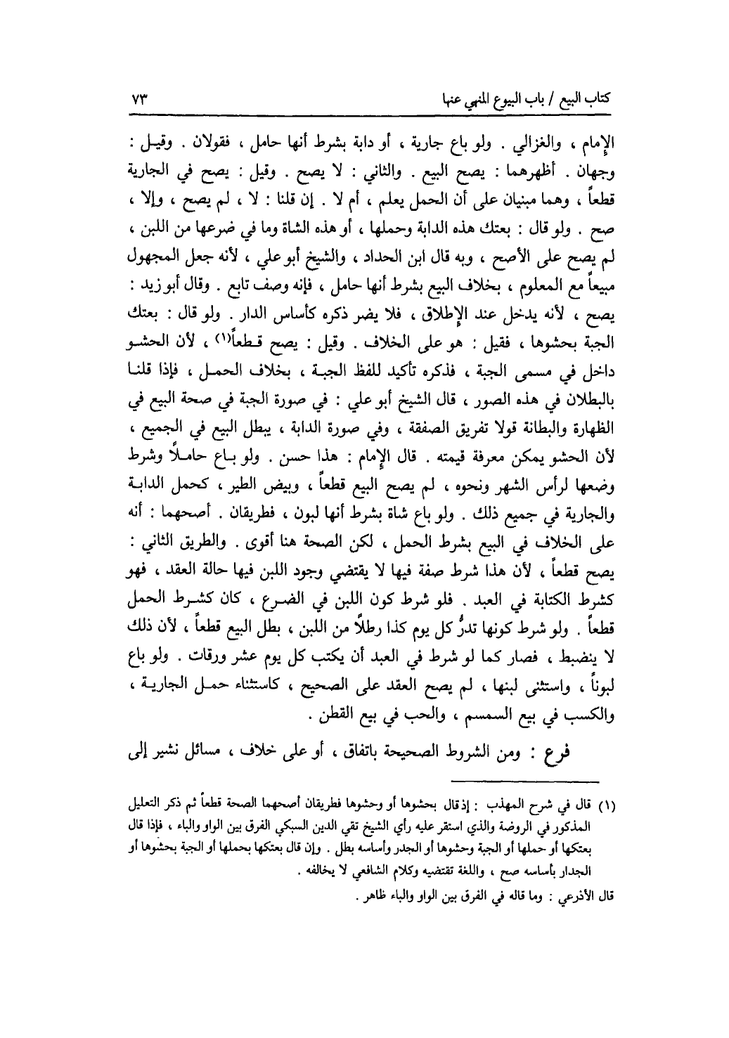 الامام، والغزالي. ولو باع جارية، أو دابة بشرط أنها حامل، فقولان. وقيل: وجهان. أظهرهما: يصح البيع. والثاني: لا يصح. وقيل: يصح في الجارية قطعا، وهما مبنيان على أن الحمل يعلم، أم لا. إن قلنا: لا، لم يصح، وإلا، صح. ولو قال: بعتك هذه الدابة وحملها، أو هذه الشاة وما في ضرعها من اللبن، لم يصح على الاصح. وبه قال ابن الحداد، والشيخ أبو علي، لانه جعل المجهول مبيعا مع المعلوم، بخلاف البيع بشرط أنها حامل، فإنه وصف تابع. وقال أبو زيد: يصح، لانه يدخل عند الاطلاق، فلا يضر ذكره كأساس الدار. ولو قال: بعتك الجبة بحشوها، فقيل: هو على الخلاف. وقيل: يصح قطعا، لان الحشو داخل في مسمى الجبة، فذكره تأكيد للفظ الجبة، بخلاف الحمل، فإذا قلنا بالبطلان في هذه الصور، قال الشيخ أبو علي: في صورة الجبة في صحة البيع في الظهارة والبطانة قولا تفريق الصفقة، وفي صورة الدابة، يبطل البيع في الجميع، لان الحشو يمكن معرفة قيمته. قال الامام: هذا حسن. ولو باع حاملا وشرط وضعها لرأس الشهر ونحوه، لم يصح البيع قطعا، وبيض الطير، كحمل الدابة والجارية في جميع ذلك. ولو باع شاة بشرط أنها لبون، فطريقان. أصحهما: أنه على الخلاف في البيع بشرط الحمل، لكن الصحة هنا أقوى. والطريق الثاني: يصح قطعا، لان هذا شرط صفة فيها لا يقتضي وجود اللبن فيها حالة العقد، فهو كشرط الكتابة في العبد. فلو شرط كون اللبن في الضرع، كان كشرط الحمل قطعا. ولو شرط كونها تدر كل يوم كذا رطلا من اللبن، بطل البيع قطعا، لان ذلك لا ينضبط، فصار كما لو شرط في العبد أن يكتب كل يوم عشر ورقات. ولو باع لبونا، واستثنى لبنها، لم يصح العقد على الصحيح، كاستثناء حمل الجارية، والكسب في بيع السمسم، والحب في بيع القطن. فرع ومن الشروط الصحيحة باتفاق، أو على خلاف مسائل نشير الى
