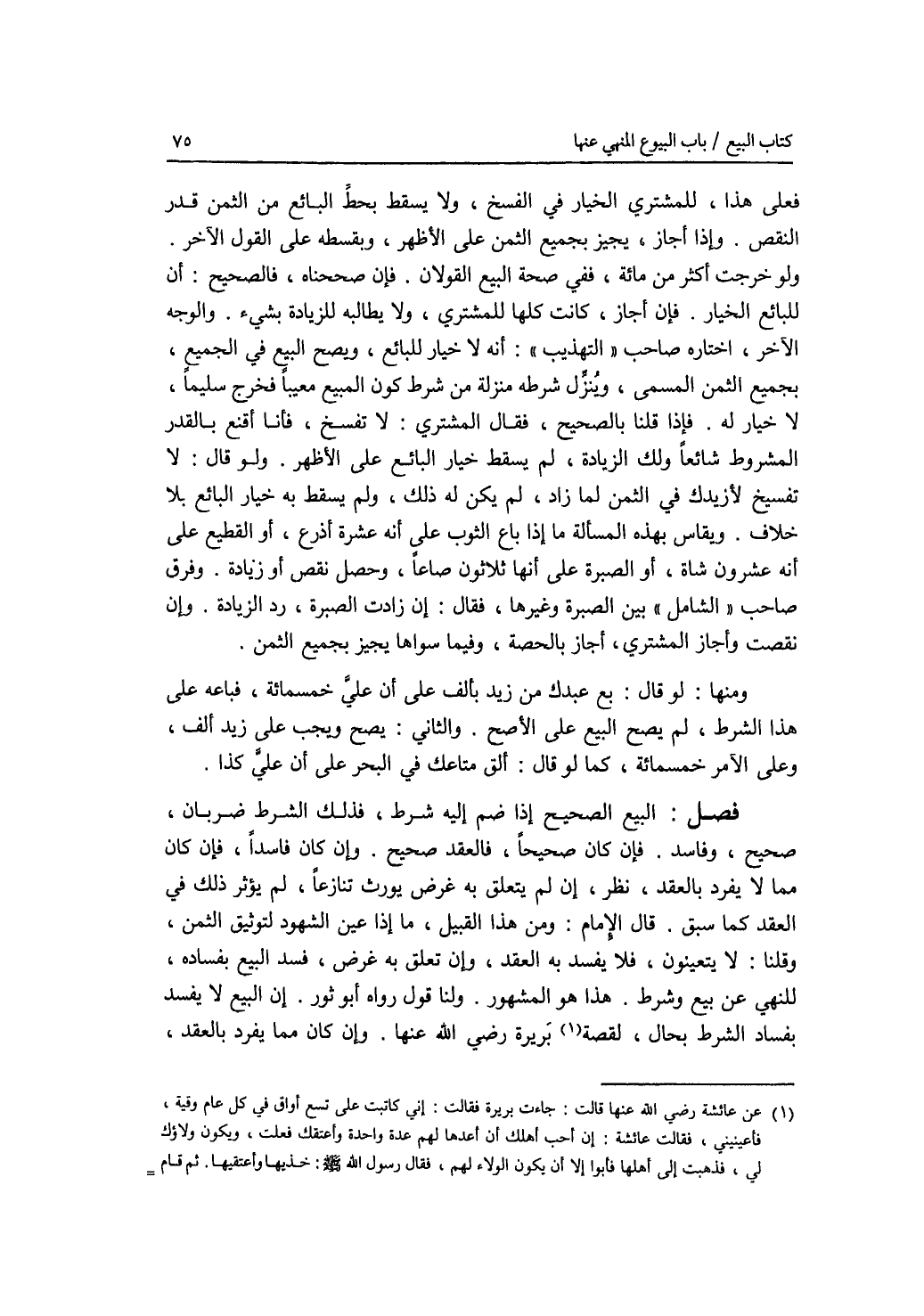 فصل البيع الصحيح إذا ضم إليه شرط، فذلك الشرط ضربان، صحيح، وفاسد. فإن كان صحيحا، فالعقد صحيح. وإن كان فاسدا، فإن كان مما لا يفرد بالعقد، نظر، إن لم يتعلق به غرض يورث تنازعا، لم يؤثر ذلك في العقد كما سبق. قال الامام: ومن هذا القبيل، ما إذا عين الشهود لتوثيق الثمن، وقلنا: لا يتعينون، فلا يفسد به العقد، وإن تعلق به غرض، فسد البيع بفساده، للنهي عن بيع وشرط. هذا هو المشهور. ولنا قول رواه أبو ثور: أن البيع لا يفسد بفساد الشرط بحال، لقصة بريرة رضي الله عنها. وإن كان مما يفرد بالعقد،