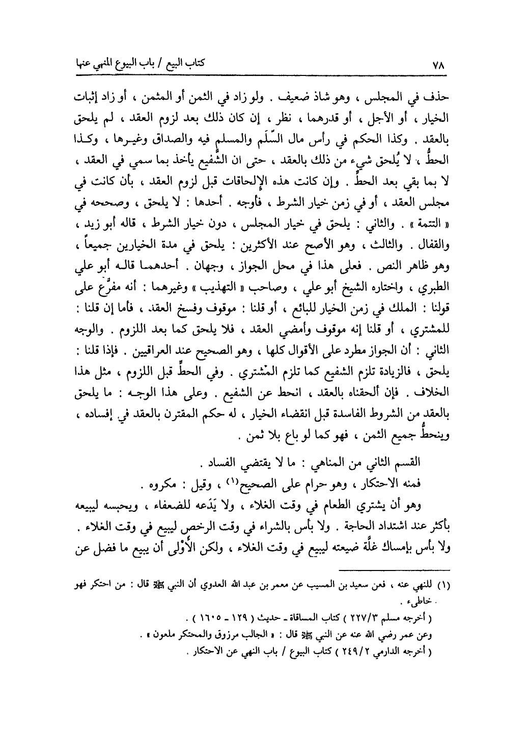 حذف في المجلس، وهو شاذ ضعيف. ولو زاد في الثمن أو المثمن، أو زاد إثبات الخيار، أو الاجل، أو قدرهما، نظر، إن كان ذلك بعد لزوم العقد، لم يلحق بالعقد. وكذا الحكم في رأس مال السلم والمسلم فيه والصداق وغيرها، وكذا الحط، لا يلحق شئ من ذلك بالعقد، حتى أن الشفيع يأخذ بما سمي في العقد، لا بما بقي بعد الحط. وإن كانت هذه الالحاقات قبل لزوم العقد، بأن كانت في مجلس العقد، أو في زمن خيار الشرط، فأوجه. أحدها: لا يلحق. وصححه في التتمة. والثاني: يلحق في خيار المجلس، دون خيار الشرط، قاله أبو زيد، والقفال. والثالث، وهو الاصح عند الاكثرين: يلحق في مدة الخيارين جميعا، وهو ظاهر النص. فعلى هذا في محل الجواز، وجهان. أحدهما قاله أبو علي الطبري، واختاره الشيخ أبو علي، وصاحب التهذيب وغيرهما: أنه مفرع على قولنا: الملك في زمن الخيار للبائع، أو قلنا: موقوف وفسخ العقد، فأما إن قلنا للمشتري، أو قلنا إنه موقوف وأمضي العقد، فلا يلحق كما بعد اللزوم. والوجه الثاني: أن الجواز مطرد عى الاقوال كلها، وهو الصحيح عند العراقيين. فإذا قلنا: يلحق، فالزيادة تلزم الشفيع كما تلزم المشتري. وفي الحط قبل اللزوم، مثل هذا الخلاف. فإن ألحقناه بالعقد، انحط عن الشفيع. وعلى هذا الوجه: ما يلحق بالعقد من الشروط الفاسدة قبل انقضاء الخيار، له حكم المقترن بالعقد في إفساده، وينحط جميع الثمن، فهو كما لو باع بلا ثمن. القسم الثاني من المناهي: ما لا يقتضي الفساد. فمنه الاحتكار، وهو حرام على الصحيح، وقيل: مكروه، وهو أن يشتري الطعام في وقت الغلاء، ولا يدعه للضعفاء، ويحبسه ليبيعه بأكثر عند اشتداد الحاجة. ولا بأس بالشراء في وقت الرخص ليبيع في وقت الغلاء. ولا بأس بإمساك غلة ضيعته ليبيع في وقت الغلاء، ولكن الاولى أن يبيع مفضل عن