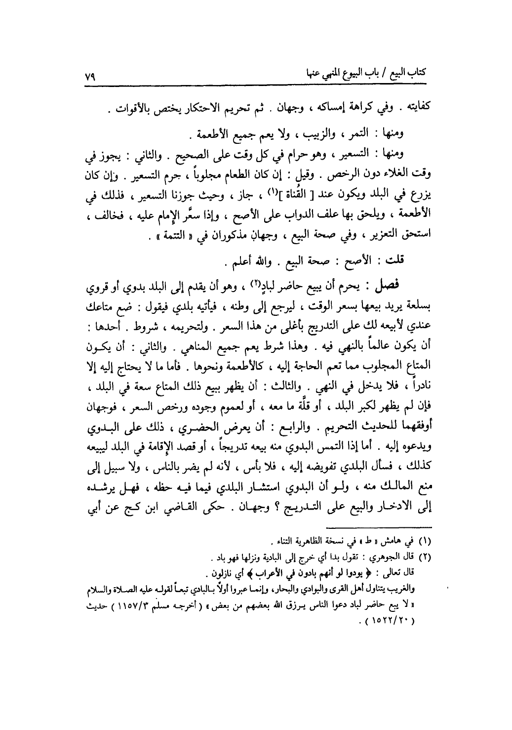 فصل يحرم أن يبيع حاضر لباد، وهو أن يقدم إلى البلد بدوي أو قروي بسلعة يريد بيعها بسعر الوقت، ليرجع إلى وطنه، فيأتيه بلدي فيقول: ضع متاعك عندي لابيعه لك على التدريج بأغلى من هذا السعر. ولتحريمه، شروط. أحدها: أن يكون عالما بالنهي فيه. وهذا شرط يعم جميع المناهي. والثاني: أن يكون المتاع المجلوب مما تعم الحاجة إليه، كالاطعمة ونحوها. فأما ما لا يحتاج إليه إلا نادرا، فلا يدخل في النهي. والثالث: أن يظهر ببيع ذلك المتاع سعة في البلد، فإن لم يظهر لكبر البلد، أو قلة ما معه، أو لعموم وجوده ورخص السعر، فوجهان أوفقهما للحديث التحريم. والرابع: أن يعرض الحضري، ذلك على البدوي ويدعوه إليه. أما إذا التمس البدوي منه بيعه تدريحا، أو قصد الاقامة في البلد ليبيعه كذلك، فسأل البلدي تفويضه إليه، فلا بأس، لانه لم يضر بالناس، ولا سبيل إلى منع المالك منه، ولو أن البلدي استشار البلدي فيما فيه حظه، فهل يرشده إلى الادخار والبيع على التدريج ؟ وجهان. حكى القاضي ابن كج عن أبي