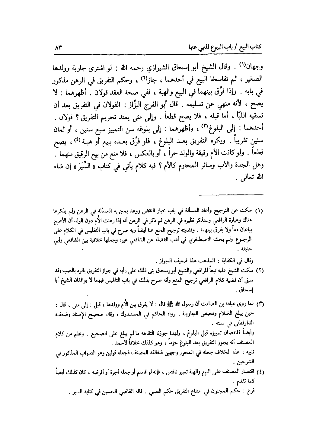 وجهان. وقال الشيخ أبو إسحق الشيرازي رحمه الله: لو اشترى جارية وولدها الصغير، ثم تفاسخا البيع في أحدهما، جاز، وحكم التفريق في الرهن مذكور في بابه. وإذا فرق بينهما في البيع والهبة، ففي صحة العقد قولان. أظهرهما: لا يصح، لانه منهي عن تسليمه. قال أبو الفراج البزاز: القولان في التفريق بعد أن تسقيه اللبأ، أما قبله، فلا يصح قطعا. وإلى متى يمتد (تحريم) التفريق ؟ قولان. أحدهما: إلى البلوغ. وأظهرهما: إلى بلوغه سن التمييز سبع سنين، أو ثمان سنين تقريبا. ويكره التفريق بعد البلوغ. فلو فرق بعده ببيع أو هبة، يصح قطعا. ولو كانت الام رقيقة والولد حرا، أو بالعكس، فلا منع من بيع الرقيق منهما. وهل الجدة والاب وسائر المحارم كالام ؟ فيه كلام يأتي في كتاب السير إن شاء الله تعالى.