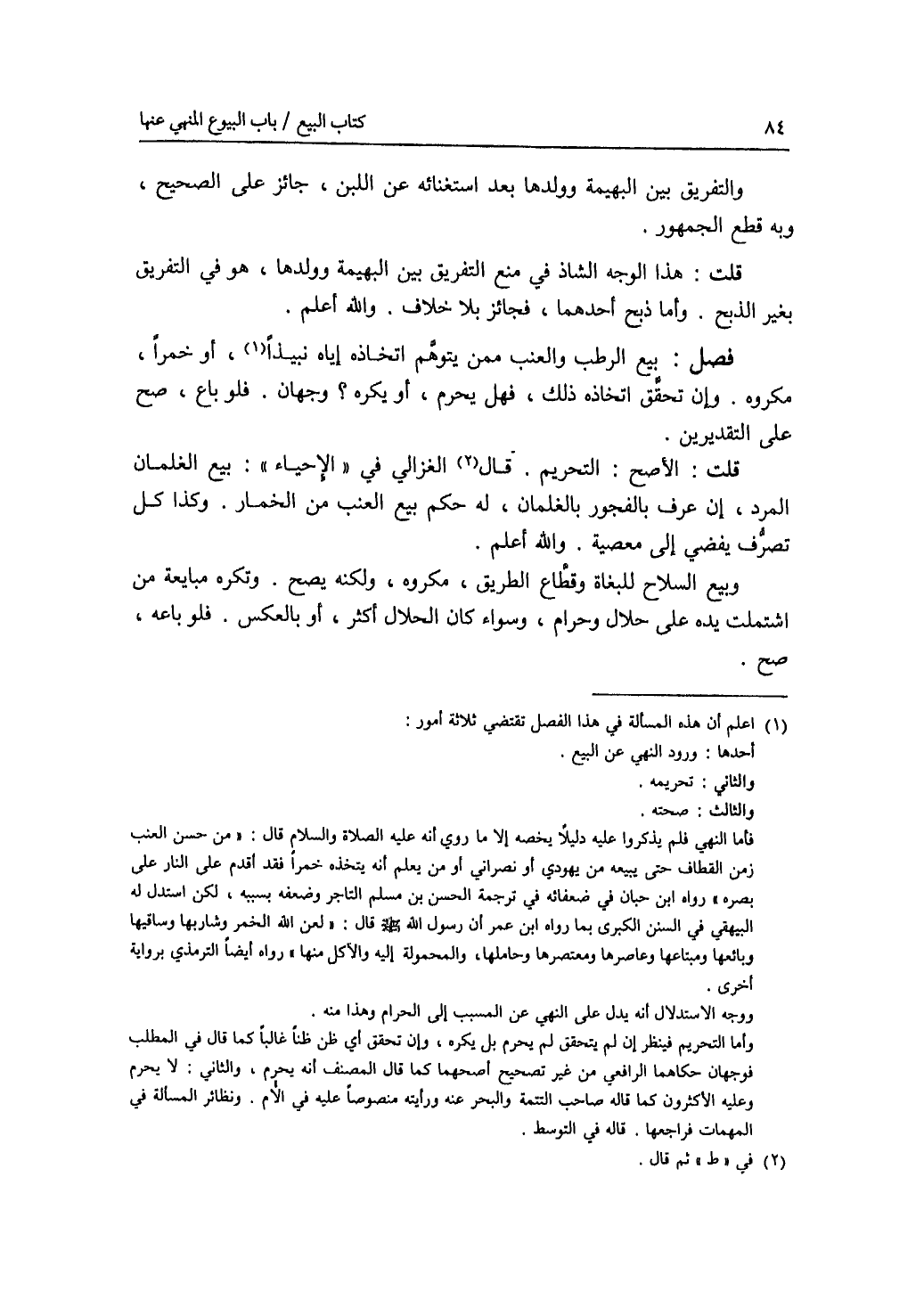 فصل بيع الرطب والعنب ممن يتوهم اتخاذه إياه نبيذا، أو خمرا، مكروه. وإن تحقق اتخاذه ذلك، فهل يحرم، أو يكره ؟ وجهان. فلو باع، صح على التقديرين. قلت: الاصح: التحريم. ثم قال الغزالي في الاحياء: بيع الغلمان المرد، إن عرف بالفجور بالغلمان، له حكم بيع العنب من الخمار. وكذا كل تصرف يفضي إلى معصية. والله أعلم. وبيع السلاح للبغاة وقطاع الطريق، مكروه، ولكنه يصح. وتكره مبايعة من اشتملت يده على حلال وحرام، وسواء كان الحلال أكثر، أو بالعكس. فلو باعه، صح.