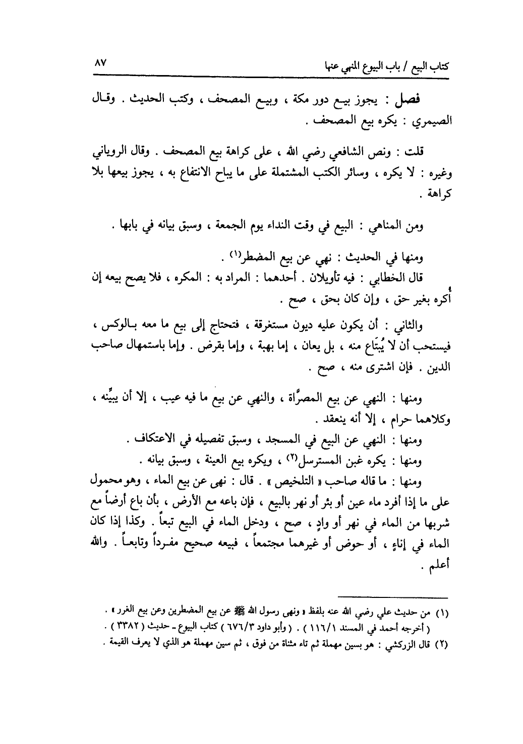 فصل يجوز بيع دور مكة، وبيع المصحف، وكتب الحديث. وقال الصيمري: يكره بيع المصحف. قلت: ونص الشافعي رضي الله عنه، على كراهة بيع المصحف. وقال الروياني وغيره: لا يكره، وسائر الكتب المشتملة على ما يباح الانتفاع به، يجوز بيعها بلا كراهة. ومن المناهي: البيع في وقت النداء يوم الجمعة، وسبق بيانه في بابها. ومنها في الحديث: نهى عن بيع المضطر. قال الخطابي: فيه تأويلان. أحدهما: المراد به: المكره، فلا يصح بيعه إن أكره بغير حق، وإن كان بحق، صح. والثاني: أن يكون عليه ديون مستغرقة، فتحتاج إلى بيع ما معه بالوكس، فيستحب أن لا يبتاع منه، بل يعان، إما بهبة، وإما بقرض، وإما باستمهال صاحب الدين. فإن اشترى منه، صح. ومنها: النهي عن بيع المصراة، والنهي عن بيع ما فيه عيب، إلا أن يبينه، وكلاهما حرام، إلا أنه ينعقد ومنها: النهي عن البيع في المسجد، وسبق تفصيله في الاعتكاف. ومنها: يكره غبن المسترسل، ويكره بيع العينة، وسبق بيانه. ومنها: ما قاله صاحب التلخيص. قال: نهى عن بيع الماء، وهو محمول على ما إذا أفرد ماء عين أو بئر أو نهر بالبيع، فإن باعه مع الارض، بأن باع أرضا مع شربها من الماء في نهر أو واد، صح، ودخل الماء في البيع تبعا. وكذا إذا كان الماء في إناء أو حوض أو غيرهما مجتمعا، فبيعه صحيح مفردا وتابعا. والله أعلم.