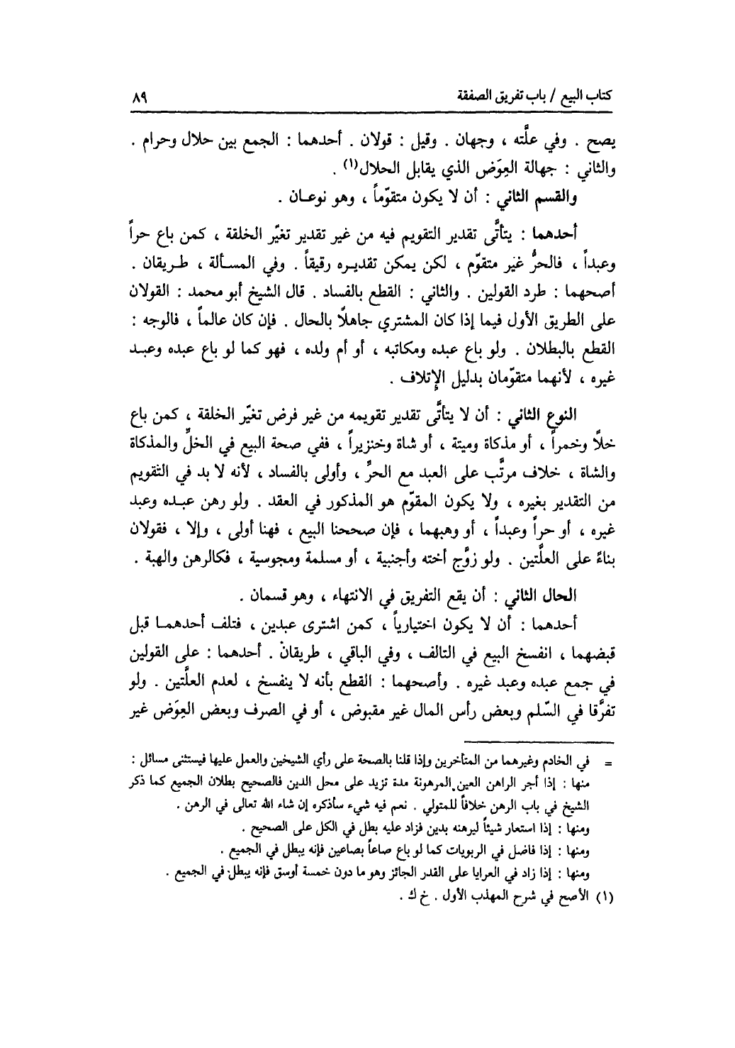 يصح. وفي علته، وجهان. وقيل: قولان. أحدهما: الجمع بين حلال وحرام. والثاني: جهالة العوض الذي يقابل الحلال. والقسم الثاني: أن لا يكون متقوما، وهو نوعان. أحدهما: يتأتى تقدير التقويم فيه من غير تقدير تغير الخلقة، كمن باع حرا وعبدا، فالحر غير متقوم، لكن يمكن تقديره رقيقا. وفي المسألة، طريقان. أصحهما: طرد القولين. والثاني: القطع بالفساد. قال الشيخ أبو محمد: القولان على الطريق الاول فيما إذا كان المشتري جاهلا بالحال. فإن كان عالما، فالوجه: القطع بالبطلان. ولو باع عبده ومكاتبه، أو أم ولده، فهو كما لو باع عبده وعبد غيره، لانهما متقومان بدليل الاتلاف. النوع الثاني: أن لا يتأتى تقدير تقويمه من غير فرض تغير الخلقة، كمن باع خلا وخمرا، أو مذكاة وميتة، أو شاة وخنزيرا، ففي صحة البيع في الخل والمذكاة والشاة، خلاف مرتب على العبد مع الحر، وأولى بالفساد، لانه لا بد في التقويم من التقدير بغيره، ولا يكون المقوم هو المذكور في العقد. ولو رهن عبده وعبد غيره، أو حرا وعبدا، أو وهبهما، فإن صححنا البيع، فهنا أولى، وإلا، فقولان بناء على العلتين. ولو زوج أخته وأجنبية، أو مسلمة ومجوسية، فكالرهن والهبة. الحال الثاني: أن يقع التفريق في الانتهاء، وهو قسمان. أحدهما: أن لا يكون اختياريا، كمن اشترى عبدين، فتلف أحدهما قبل قبضهما، انفسخ البيع في التالف، وفي الباقي، طريقان. أحدهما: على القولين في جمع عبده وعبد غيره. وأصحهما: القطع بأنه لا ينفسخ، لعدم العلتين. ولو تفرقا في السلم وبعض رأس المال غير مقبوض، أو في الصرف وبعض العوض غير