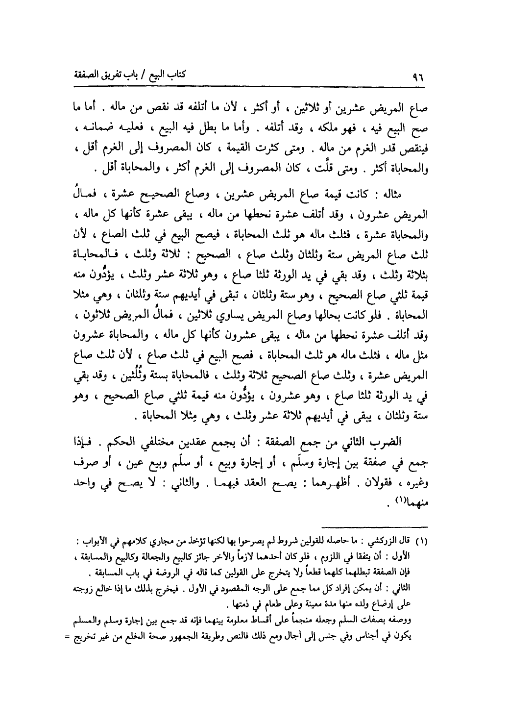صاع المريض عشرين أو ثلاثين، أو أكثر، لان ما أتلفه قد نقص من ماله. أما ما صح البيع فيه، فهو ملكه، وقد أتلفه. وأما ما بطل فيه البيع، فعليه ضمانه، فينقص قدر الغرم من ماله. ومتى كثرت القيمة، كان المصروف إلى الغرم أقل، والمحاباة أكثر. ومتى قلت، كان المصروف إلى الغرم أكثر، والمحاباة أقل. مثاله: كانت قيمة صاع المريض عشرين، وصاع الصحيح عشرة، فمال المريض عشرون، وقد أتلف عشرة نحطها من ماله، يبقى عشرة كأنها كل ماله، والمحاباة عشرة، فثلث ماله هو ثلث المحاباة، فيصح البيع في ثلث الصاع، لان ثلث صاع المريض ستة وثلثان وثلث صاع، الصحيح: ثلاثة وثلث، فالمحاباة بثلاثة وثلث، وقد بقي في يد الورثة ثلثا صاع، وهو ثلاثة عشر وثلث، يؤدون منه قيمة ثلثي صاع الصحيح، وهو ستة وثلثان، تبقى في أيديهم ستة وثلثان، وهي مثلا المحاباة. فلو كانت بحالها وصاع المريض يساوي ثلاثين، فمال المريض ثلاثون، وقد أتلف عشرة نحطها من ماله، يبقى عشرون كأنها كل ماله، والمحاباة عشرون مثل ماله، فثلث ماله هو ثلث المحاباة، فصح البيع في ثلث صاع، لان ثلث صاع المريض عشرة، وثلث صاع الصحيح ثلاثة وثلث، فالمحاباة بستة وثلثين، وقد بقي في يد الورثة ثلثا صاع، وهو عشرون، يؤدون منه قيمة ثلثي صاع الصحيح، وهو ستة وثلثان، يبقى في أيديهم ثلاثة عشر وثلث، وهي مثلا المحاباة. الضرب الثاني من جمع الصفقة: أن يجمع عقدين مختلفي الحكم. فإذا جمع في صفقة بين إجارة وسلم، أو إجارة وبيع، أو سلم وبيع عين، أو صرف وغيره، فقولان. أظهرهما: يصح العقد فيهما. والثاني: لا يصح في واحد منهما.