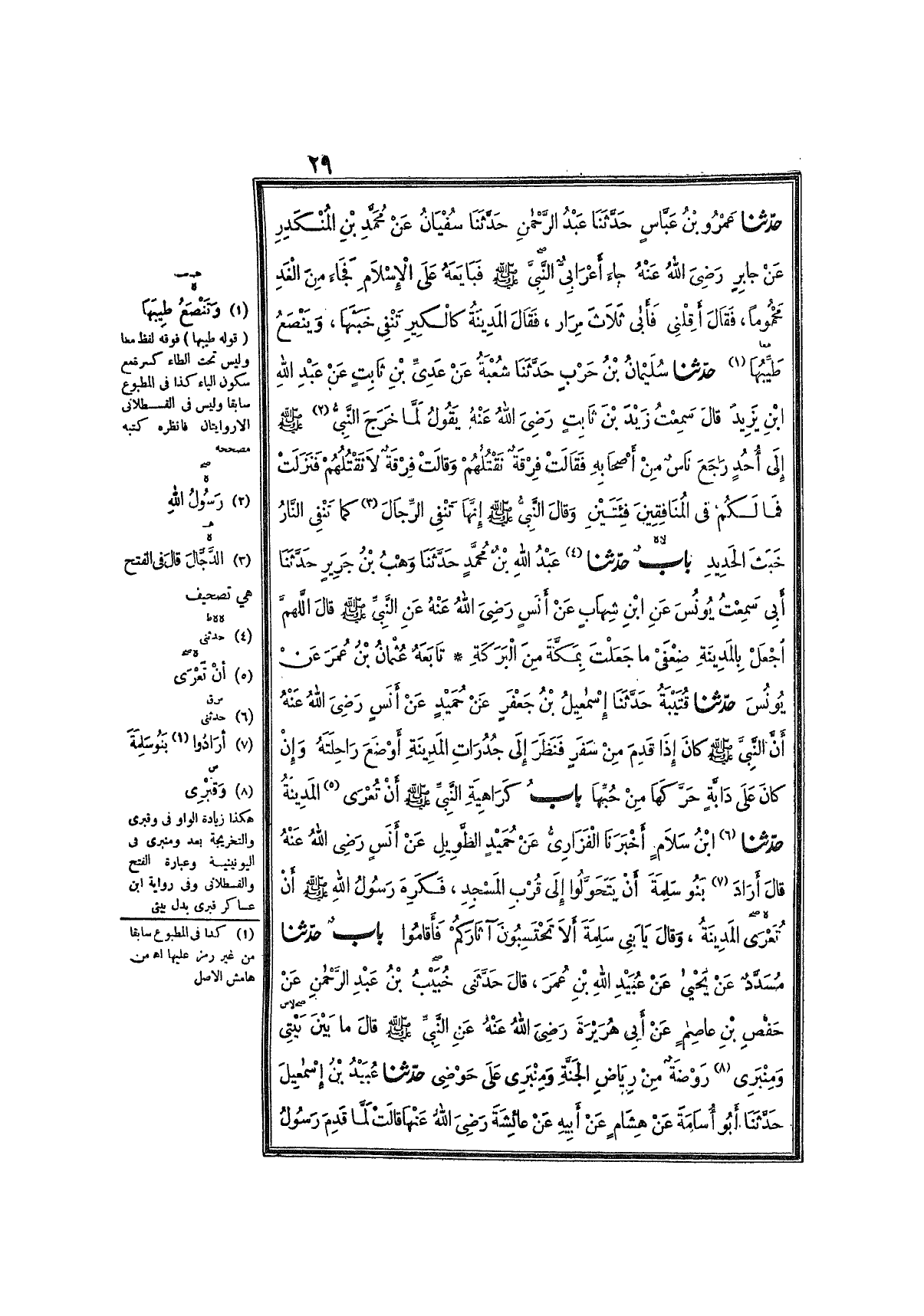 1887- حَدَّثَنَا ابْنُ سَلاَمٍ ، أَخْبَرَنَا الفَزَارِيُّ ، عَنْ حُمَيْدٍ الطَّوِيلِ ، عَنْ أَنَسٍ ، رَضِيَ اللَّهُ عَنْهُ ، قَالَ : أَرَادَ بَنُو سَلِمَةَ أَنْ يَتَحَوَّلُوا إِلَى قُرْبِ المَسْجِدِ ، فَكَرِهَ رَسُولُ اللهِ صَلَّى اللَّهُ عَلَيْهِ وَسَلَّمَ أَنْ تُعْرَى المَدِينَةُ , وَقَالَ : يَا بَنِي سَلِمَةَ , أَلاَ تَحْتَسِبُونَ آثَارَكُمْ , فَأَقَامُوا.
