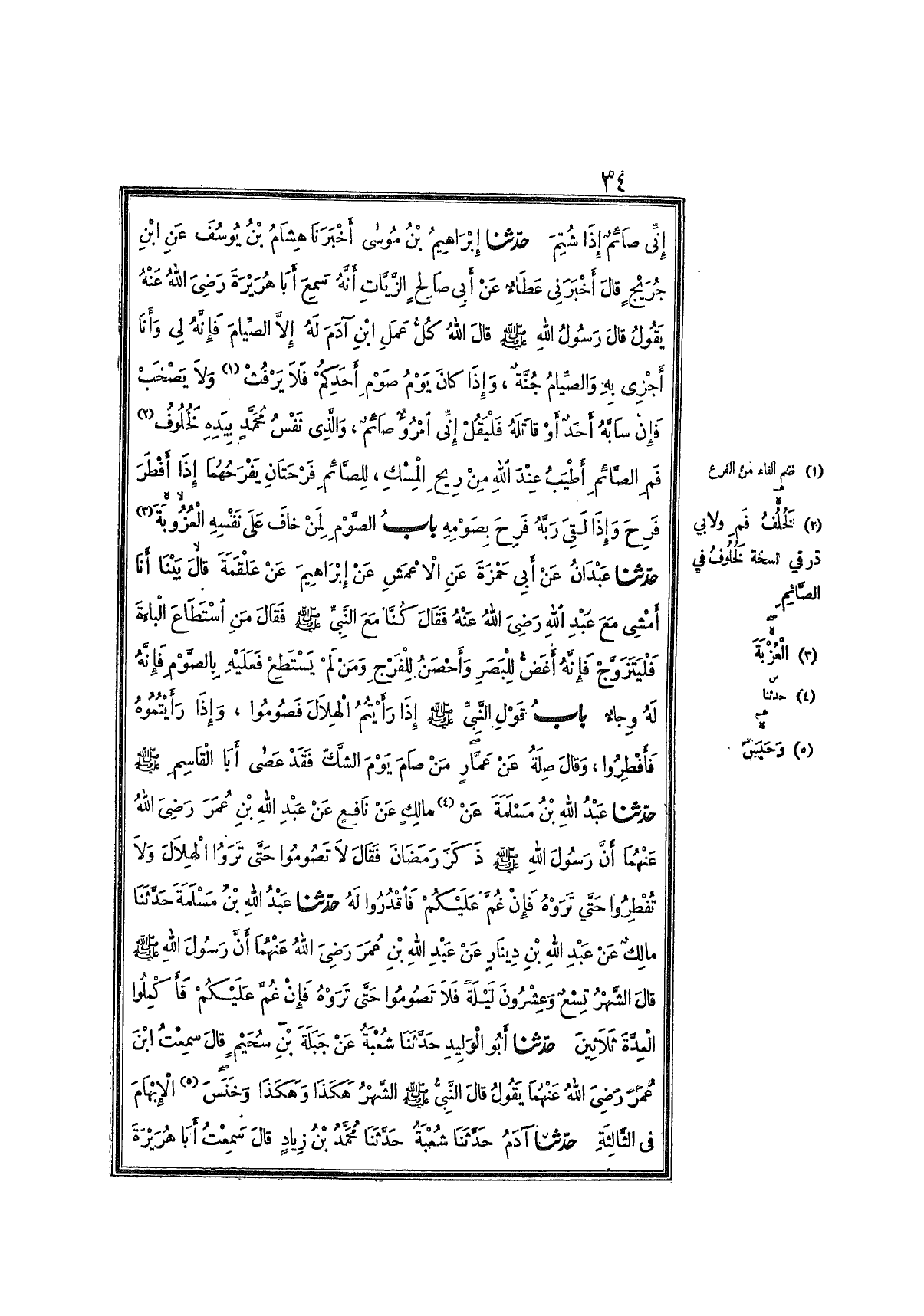 1907- حَدَّثَنَا عَبْدُ اللهِ بْنُ مَسْلَمَةَ ، حَدَّثَنَا مَالِكٌ ، عَنْ عَبْدِ اللهِ بْنِ دِينَارٍ ، عَنْ عَبْدِ اللهِ بْنِ عُمَرَ ، رَضِيَ اللَّهُ عَنْهُمَا ، أَنَّ رَسُولَ اللهِ صَلَّى اللَّهُ عَلَيْهِ وَسَلَّمَ قَالَ : الشَّهْرُ تِسْعٌ وَعِشْرُونَ لَيْلَةً ، فَلاَ تَصُومُوا حَتَّى تَرَوْهُ ، فَإِنْ غُمَّ عَلَيْكُمْ , فَأَكْمِلُوا العِدَّةَ ثَلاَثِينَ.