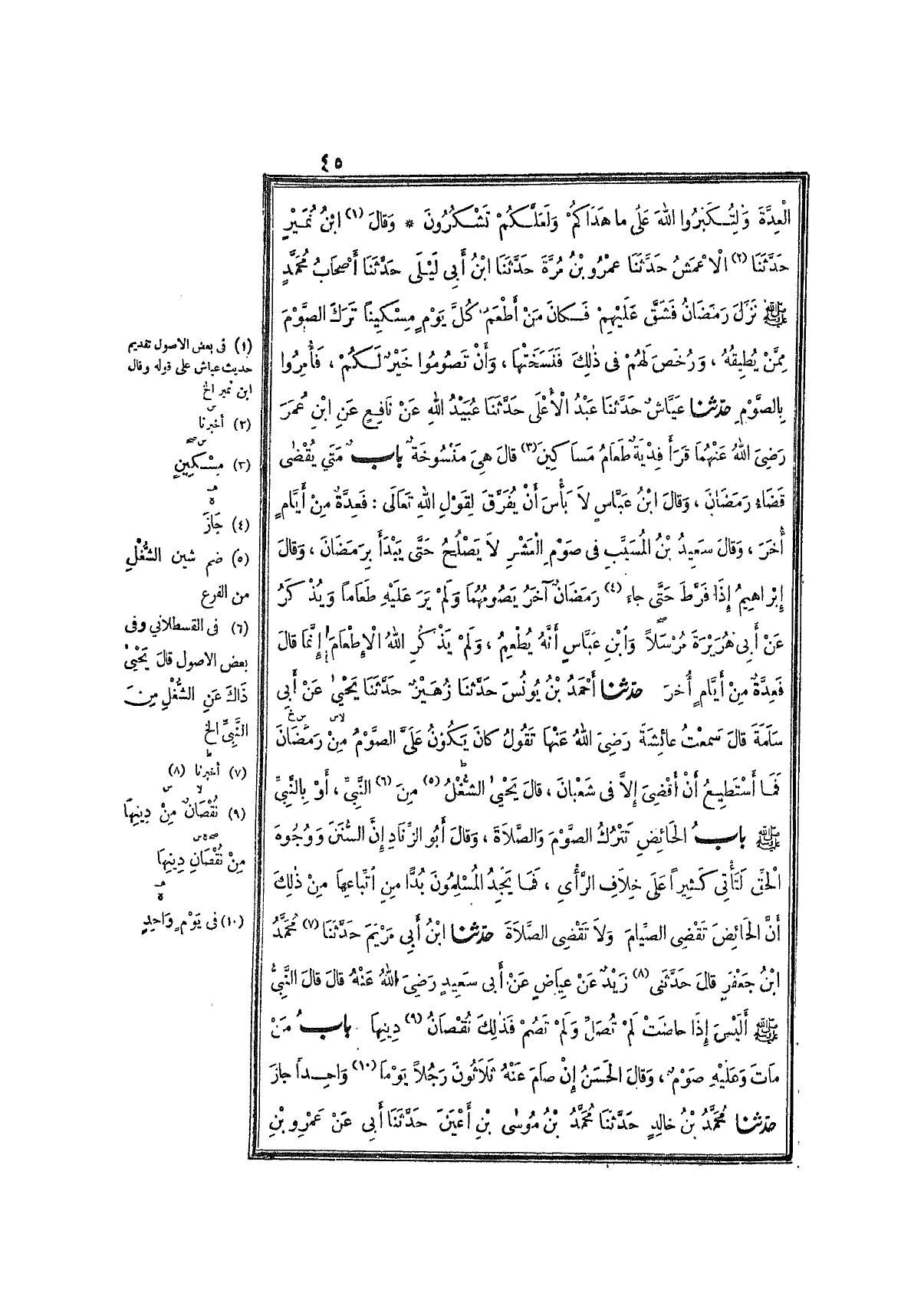 وَقَالَ ابْنُ نُمَيْرٍ ، حَدَّثَنَا الأَعْمَشُ ، حَدَّثَنَا عَمْرُو بْنُ مُرَّةَ ، حَدَّثَنَا ابْنُ أَبِي لَيْلَى ، حَدَّثَنَا أَصْحَابُ مُحَمَّدٍ صَلَّى اللَّهُ عَلَيْهِ وَسَلَّمَ : نَزَلَ رَمَضَانُ فَشُقَّ عَلَيْهِمْ ، فَكَانَ مَنْ أَطْعَمَ كُلَّ يَوْمٍ مِسْكِينًا تَرَكَ الصَّوْمَ مِمَّنْ يُطِيقُهُ ، وَرُخِّصَ لَهُمْ فِي ذَلِكَ ، فَنَسَخَتْهَا : {وَأَنْ تَصُومُوا خَيْرٌ لَكُمْ} فَأُمِرُوا بِالصَّوْمِ.