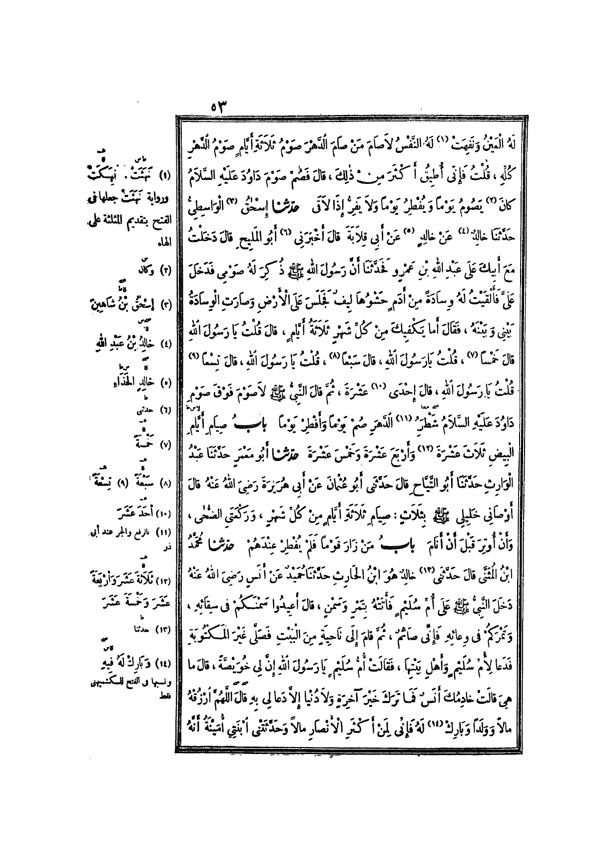 1980- حَدَّثَنَا إِسْحَاقُ بْنُ شَاهِينَ الوَاسِطِيُّ ، حَدَّثَنَا خَالِدُ بْنُ عَبْدِ اللهِ ، عَنْ خَالِدٍ الْحَذَّاءِ ، عَنْ أَبِي قِلاَبَةَ ، قَالَ : أَخْبَرَنِي أَبُو المَلِيحِ ، قَالَ : دَخَلْتُ مَعَ أَبِيكَ عَلَى عَبْدِ اللهِ بْنِ عَمْرٍو ، فَحَدَّثَنَا ؛ أَنَّ رَسُولَ اللهِ صَلَّى اللَّهُ عَلَيْهِ وَسَلَّمَ ذُكِرَ لَهُ صَوْمِي ، فَدَخَلَ عَلَيَّ ، فَأَلْقَيْتُ لَهُ وِسَادَةً مِنْ أَدَمٍ حَشْوُهَا لِيفٌ ، فَجَلَسَ عَلَى الأَرْضِ ، وَصَارَتِ الوِسَادَةُ بَيْنِي وَبَيْنَهُ ، فَقَالَ : أَمَا يَكْفِيكَ مِنْ كُلِّ شَهْرٍ ثَلاَثَةُ أَيَّامٍ ؟ قَالَ : قُلْتُ : يَا رَسُولَ اللهِ ، قَالَ : خَمْسًا ، قُلْتُ : يَا رَسُولَ اللهِ ، قَالَ : سَبْعًا ، قُلْتُ : يَا رَسُولَ اللهِ ، قَالَ : تِسْعًا ، قُلْتُ : يَا رَسُولَ اللهِ ، قَالَ : إِحْدَى عَشْرَةَ ، ثُمَّ قَالَ النَّبِيُّ صَلَّى اللَّهُ عَلَيْهِ وَسَلَّمَ : لاَ صَوْمَ فَوْقَ صَوْمِ دَاوُدَ عَلَيْهِ السَّلاَمُ , شَطْرَ الدَّهَرِ ، صُمْ يَوْمًا ، وَأَفْطِرْ يَوْمًا.