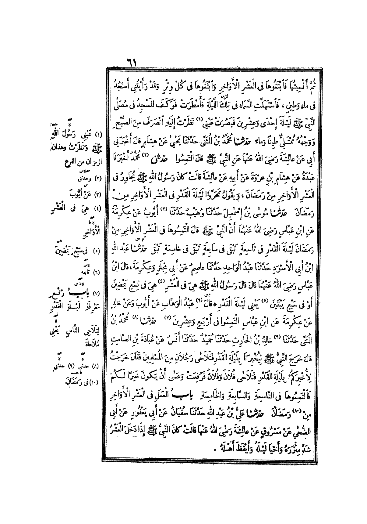 2021- حَدَّثَنَا مُوسَى بْنُ إِسْمَاعِيلَ ، حَدَّثَنَا وُهَيْبٌ ، حَدَّثَنَا أَيُّوبُ ، عَنْ عِكْرِمَةَ ، عَنِ ابْنِ عَبَّاسٍ ، رَضِيَ اللَّهُ عَنْهُمَا ؛ أَنَّ النَّبِيَّ صَلَّى اللَّهُ عَلَيْهِ وَسَلَّمَ ، قَالَ : التَمِسُوهَا فِي العَشْرِ الأَوَاخِرِ مِنْ رَمَضَانَ , لَيْلَةَ القَدْرِ ، فِي تَاسِعَةٍ تَبْقَى ، فِي سَابِعَةٍ تَبْقَى ، فِي خَامِسَةٍ تَبْقَى.