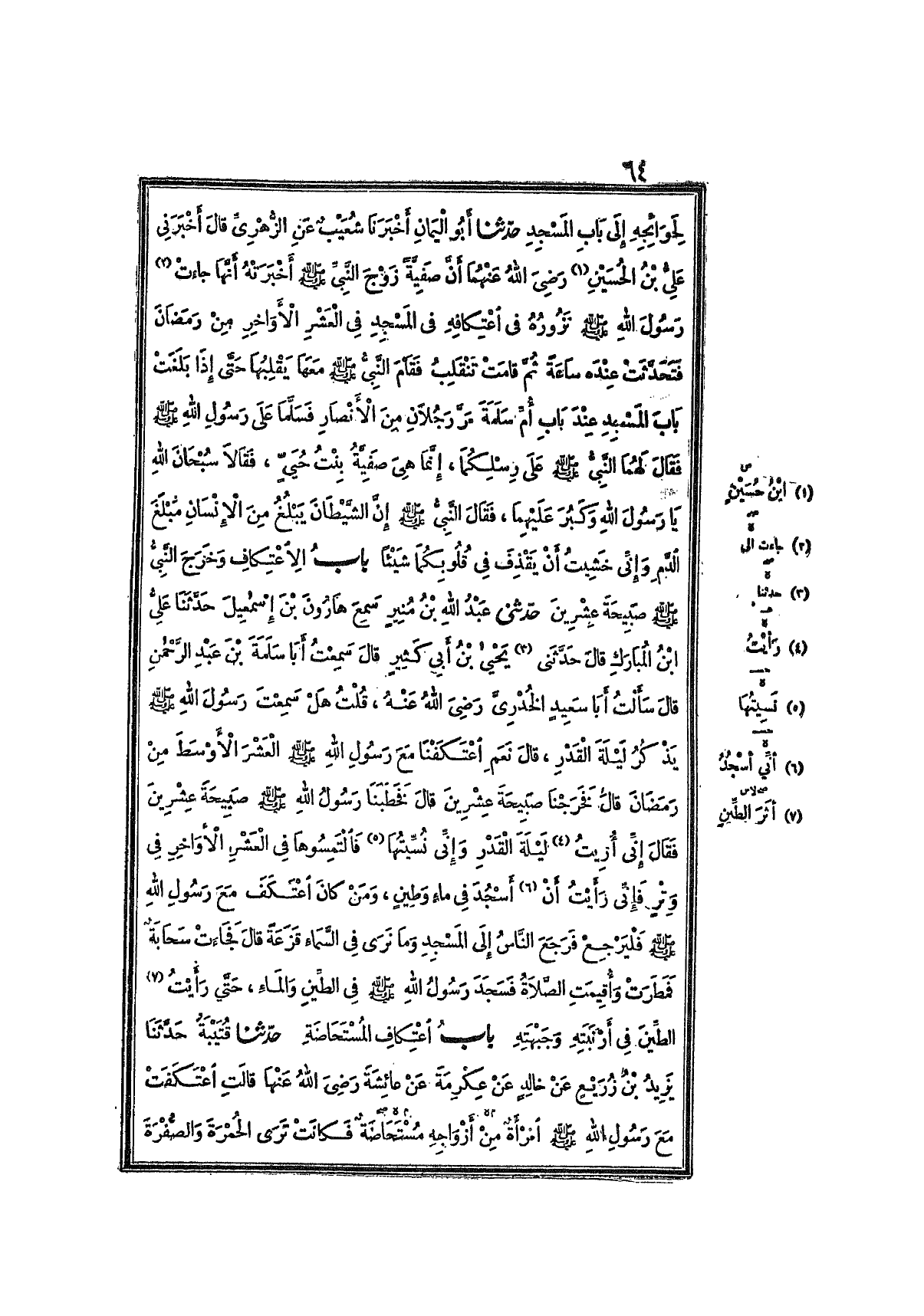 2035- حَدَّثَنَا أَبُو اليَمَانِ ، أَخْبَرَنَا شُعَيْبٌ ، عَنِ الزُّهْرِيِّ ، قَالَ : أَخْبَرَنِي عَلِيُّ بْنُ الحُسَيْنِ ، رَضِيَ اللَّهُ عَنْهُمَا ؛ أَنَّ صَفِيَّةَ ، زَوْجَ النَّبِيِّ صَلَّى اللَّهُ عَلَيْهِ وَسَلَّمَ أَخْبَرَتْهُ , أَنَّهَا جَاءَتْ إِلَى رَسُولِ اللهِ صَلَّى اللَّهُ عَلَيْهِ وَسَلَّمَ تَزُورُهُ فِي اعْتِكَافِهِ فِي المَسْجِدِ , فِي العَشْرِ الأَوَاخِرِ مِنْ رَمَضَانَ ، فَتَحَدَّثَتْ عِنْدَهُ سَاعَةً ، ثُمَّ قَامَتْ تَنْقَلِبُ ، فَقَامَ النَّبِيُّ صَلَّى اللَّهُ عَلَيْهِ وَسَلَّمَ مَعَهَا يَقْلِبُهَا ، حَتَّى إِذَا بَلَغَتْ بَابَ المَسْجِدِ عِنْدَ بَابِ أُمِّ سَلَمَةَ ، مَرَّ رَجُلاَنِ مِنَ الأَنْصَارِ ، فَسَلَّمَا عَلَى رَسُولِ اللهِ صَلَّى اللَّهُ عَلَيْهِ وَسَلَّمَ ، فَقَالَ لَهُمَا النَّبِيُّ صَلَّى اللَّهُ عَلَيْهِ وَسَلَّمَ : عَلَى رِسْلِكُمَا ، إِنَّمَا هِيَ صَفِيَّةُ بِنْتُ حُيَيٍّ ، فَقَالاَ : سُبْحَانَ اللهِ يَا رَسُولَ اللهِ ، وَكَبُرَ عَلَيْهِمَا ، فَقَالَ النَّبِيُّ صَلَّى اللَّهُ عَلَيْهِ وَسَلَّمَ : إِنَّ الشَّيْطَانَ يَبْلُغُ مِنِ ابْنِ آدَمَ مَبْلَغَ الدَّمِ ، وَإِنِّي خَشِيتُ أَنْ يَقْذِفَ فِي قُلُوبِكُمَا شَيْئًا.