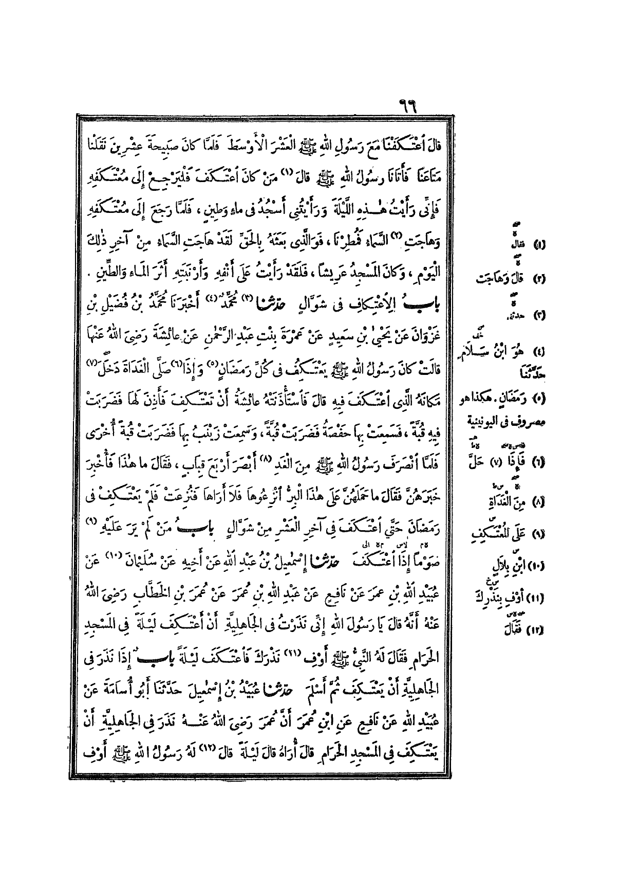 2041- حَدَّثَنَا مُحَمَّدٌ (1)، أَخْبَرَنَا مُحَمَّدُ بْنُ فُضَيْلِ بْنِ غَزْوَانَ ، عَنْ يَحْيَى بْنِ سَعِيدٍ ، عَنْ عَمْرَةَ بِنْتِ عَبْدِ الرَّحْمَنِ ، عَنْ عَائِشَةَ ، رَضِيَ اللَّهُ عَنْهَا ، قَالَتْ : كَانَ رَسُولُ اللهِ صَلَّى اللَّهُ عَلَيْهِ وَسَلَّمَ يَعْتَكِفُ فِي كُلِّ رَمَضَانٍ ، فَإِذَا صَلَّى الغَدَاةَ دَخَلَ مَكَانَهُ الَّذِي اعْتَكَفَ فِيهِ ، قَالَ : فَاسْتَأْذَنَتْهُ عَائِشَةُ أَنْ تَعْتَكِفَ ، فَأَذِنَ لَهَا ، فَضَرَبَتْ فِيهِ قُبَّةً ، فَسَمِعَتْ بِهَا حَفْصَةُ ، فَضَرَبَتْ قُبَّةً ، وَسَمِعَتْ زَيْنَبُ بِهَا ، فَضَرَبَتْ قُبَّةً أُخْرَى ، فَلَمَّا انْصَرَفَ رَسُولُ اللهِ صَلَّى اللَّهُ عَلَيْهِ وَسَلَّمَ مِنَ الغَدِ أَبْصَرَ أَرْبَعَ قِبَابٍ ، فَقَالَ : مَا هَذَا ؟ فَأُخْبِرَ خَبَرَهُنَّ ، فَقَالَ : مَا حَمَلَهُنَّ عَلَى هَذَا ؟ الْبِرُّ ؟ انْزِعُوهَا فَلاَ أَرَاهَا ، فَنُزِعَتْ ، فَلَمْ يَعْتَكِفْ فِي رَمَضَانَ حَتَّى اعْتَكَفَ فِي آخِرِ العَشْرِ مِنْ شَوَّالٍ.
