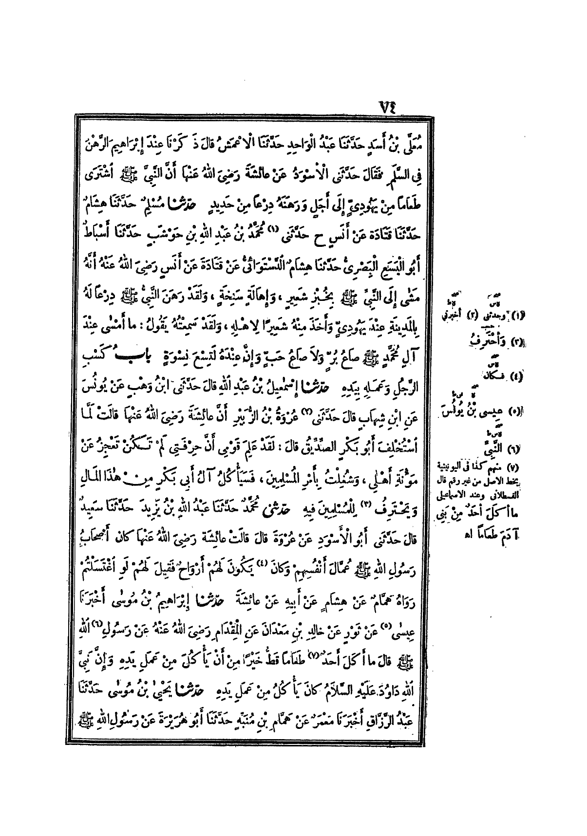 2069- حَدَّثَنَا مُسْلِمٌ ، حَدَّثَنَا هِشَامٌ ، حَدَّثَنَا قَتَادَةُ ، عَنْ أَنَسٍ (ح) وَحَدَّثَنِي مُحَمَّدُ بْنُ عَبْدِ اللهِ بْنِ حَوْشَبٍ ، حَدَّثَنَا أَسْبَاطٌ أَبُو اليَسَعِ البَصْرِيُّ ، حَدَّثَنَا هِشَامٌ الدَّسْتُوَائِيُّ ، عَنْ قَتَادَةَ ، عَنْ أَنَسٍ ، رَضِيَ اللَّهُ عَنْهُ : أَنَّهُ مَشَى إِلَى النَّبِيِّ صَلَّى اللَّهُ عَلَيْهِ وَسَلَّمَ بِخُبْزِ شَعِيرٍ ، وَإِهَالَةٍ سَنِخَةٍ ، وَلَقَدْ رَهَنَ النَّبِيُّ صَلَّى اللَّهُ عَلَيْهِ وَسَلَّمَ دِرْعًا لَهُ بِالْمَدِينَةِ عِنْدَ يَهُودِيٍّ ، وَأَخَذَ مِنْهُ شَعِيرًا لأَهْلِهِ , وَلَقَدْ سَمِعْتُهُ يَقُولُ : مَا أَمْسَى عِنْدَ آلِ مُحَمَّدٍ صَلَّى اللَّهُ عَلَيْهِ وَسَلَّمَ صَاعُ بُرٍّ ، وَلاَ صَاعُ حَبٍّ ، وَإِنَّ عِنْدَهُ لَتِسْعَ نِسْوَةٍ.