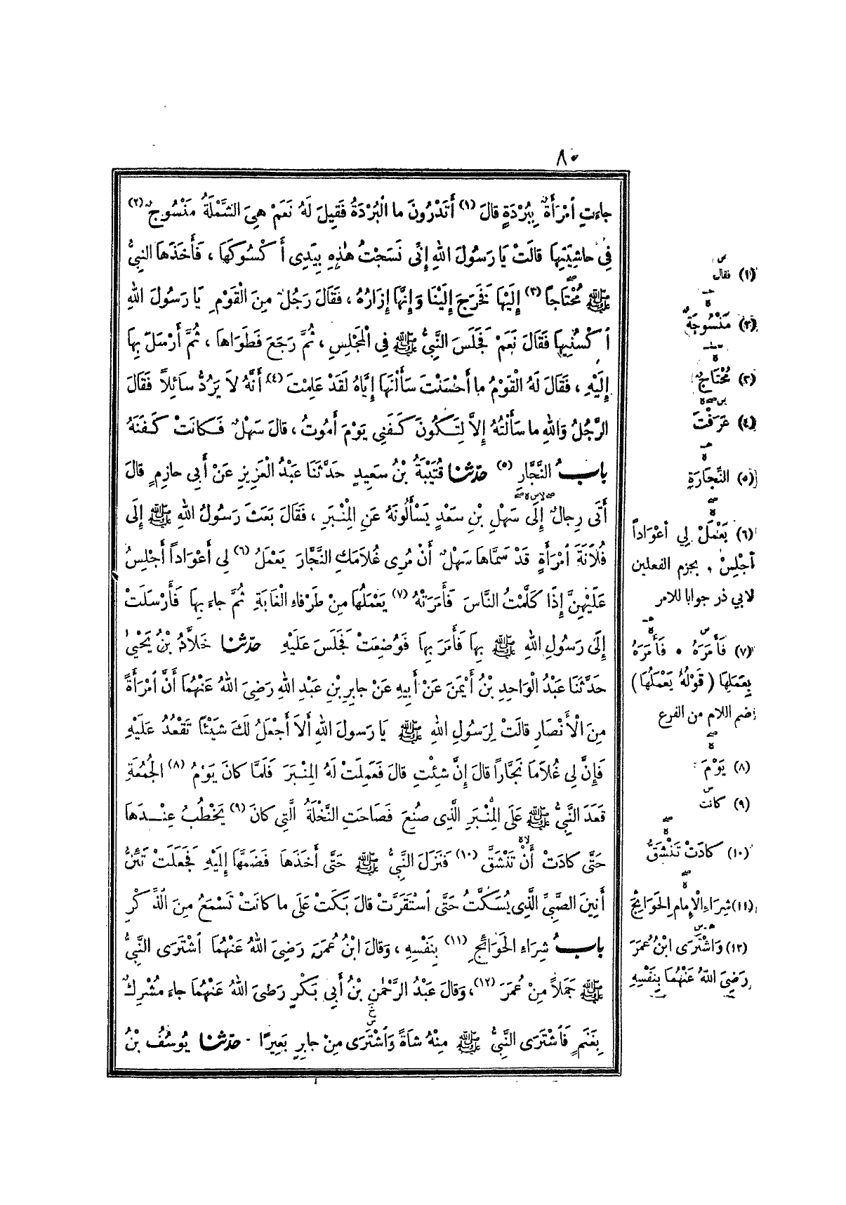 2094- حَدَّثَنَا قُتَيْبَةُ بْنُ سَعِيدٍ ، حَدَّثَنَا عَبْدُ العَزِيزِ ، عَنْ أَبِي حَازِمٍ ، قَالَ : أَتَى رِجَالٌ إِلَى سَهْلِ بْنِ سَعْدٍ يَسْأَلُونَهُ عَنِ المِنْبَرِ ، فَقَالَ : بَعَثَ رَسُولُ اللهِ صَلَّى اللَّهُ عَلَيْهِ وَسَلَّمَ إِلَى فُلاَنَةَ ، امْرَأَةٍ قَدْ سَمَّاهَا سَهْلٌ : أَنْ مُرِي غُلاَمَكِ النَّجَّارَ ، يَعْمَلُ لِي أَعْوَادًا ، أَجْلِسُ عَلَيْهِنَّ إِذَا كَلَّمْتُ النَّاسَ ، فَأَمَرَتْهُ يَعْمَلُهَا مِنْ طَرْفَاءِ الغَابَةِ ، ثُمَّ جَاءَ بِهَا ، فَأَرْسَلَتْ إِلَى رَسُولِ اللهِ صَلَّى اللَّهُ عَلَيْهِ وَسَلَّمَ بِهَا ، فَأَمَرَ بِهَا فَوُضِعَتْ ، فَجَلَسَ عَلَيْهِ.