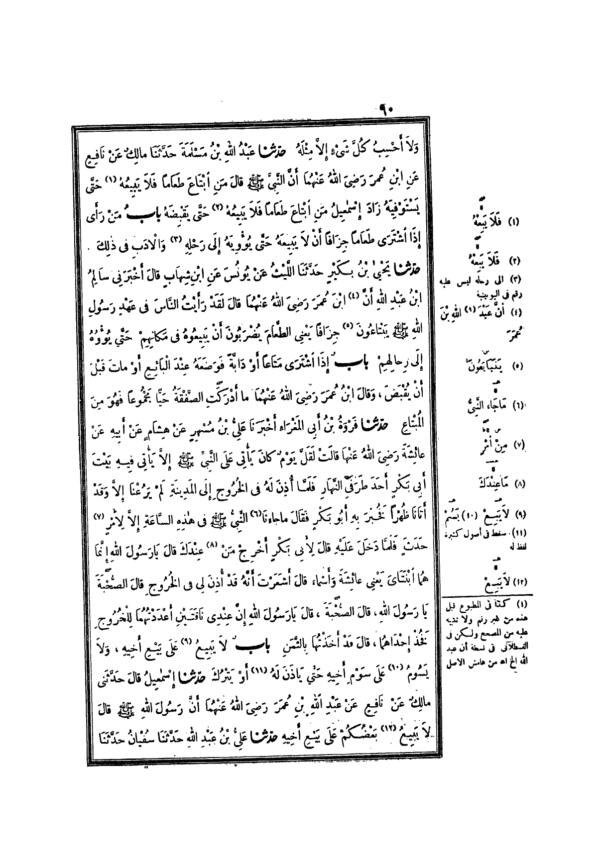 2136- حَدَّثَنَا عَبْدُ اللهِ بْنُ مَسْلَمَةَ ، حَدَّثَنَا مَالِكٌ ، عَنْ نَافِعٍ ، عَنِ ابْنِ عُمَرَ ، رَضِيَ اللَّهُ عَنْهُمَا ؛ أَنَّ النَّبِيَّ صَلَّى اللَّهُ عَلَيْهِ وَسَلَّمَ قَالَ : مَنِ ابْتَاعَ طَعَامًا فَلاَ يَبِعْهُ حَتَّى يَسْتَوْفِيَهُ ، زَادَ إِسْمَاعِيلُ : مَنِ ابْتَاعَ طَعَامًا فَلاَ يَبِعْهُ حَتَّى يَقْبِضَهُ.