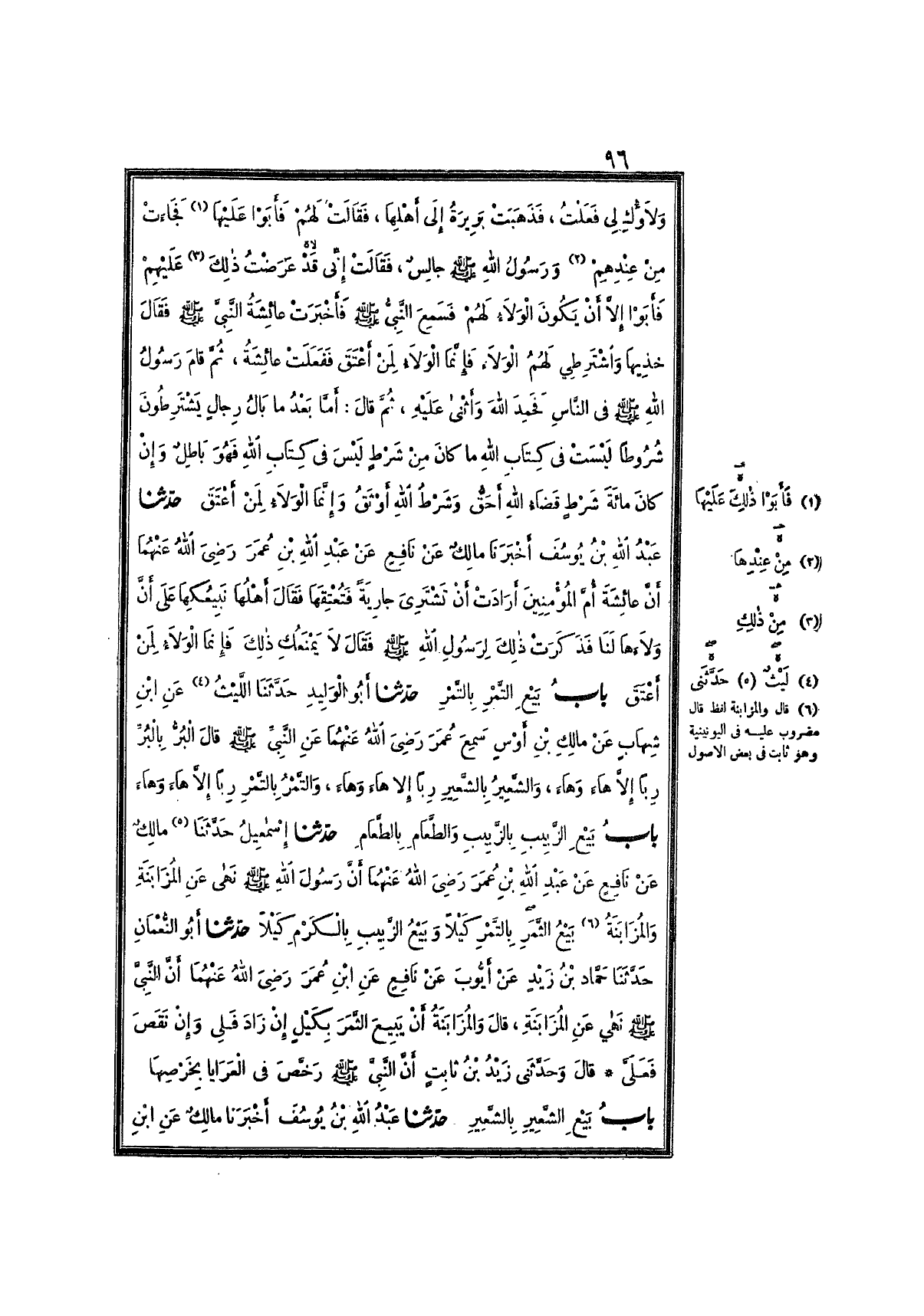 2174- حَدَّثَنَا عَبْدُ اللهِ بْنُ يُوسُفَ ، أَخْبَرَنَا مَالِكٌ ، عَنِ ابْنِ شِهَابٍ ، عَنْ مَالِكِ بْنِ أَوْسٍ أَخْبَرَهُ , أَنَّهُ التَمَسَ صَرْفًا بِمِئَةِ دِينَارٍ ، فَدَعَانِي طَلْحَةُ بْنُ عُبَيْدِ اللهِ ، فَتَرَاوَضْنَا حَتَّى اصْطَرَفَ مِنِّي ، فَأَخَذَ الذَّهَبَ يُقَلِّبُهَا فِي يَدِهِ ، ثُمَّ قَالَ : حَتَّى يَأْتِيَ خَازِنِي مِنَ الغَابَةِ ، وَعُمَرُ يَسْمَعُ ذَلِكَ ، فَقَالَ : وَاللهِ لاَ تُفَارِقُهُ حَتَّى تَأْخُذَ مِنْهُ ، قَالَ رَسُولُ اللهِ صَلَّى اللَّهُ عَلَيْهِ وَسَلَّمَ : الذَّهَبُ بِالذَّهَبِ رِبًا , إِلاَّ هَاءَ وَهَاءَ ، وَالبُرُّ بِالْبُرِّ رِبًا , إِلاَّ هَاءَ وَهَاءَ ، وَالشَّعِيرُ بِالشَّعِيرِ رِبًا , إِلاَّ هَاءَ وَهَاءَ ، وَالتَّمْرُ بِالتَّمْرِ رِبًا , إِلاَّ هَاءَ وَهَاءَ.