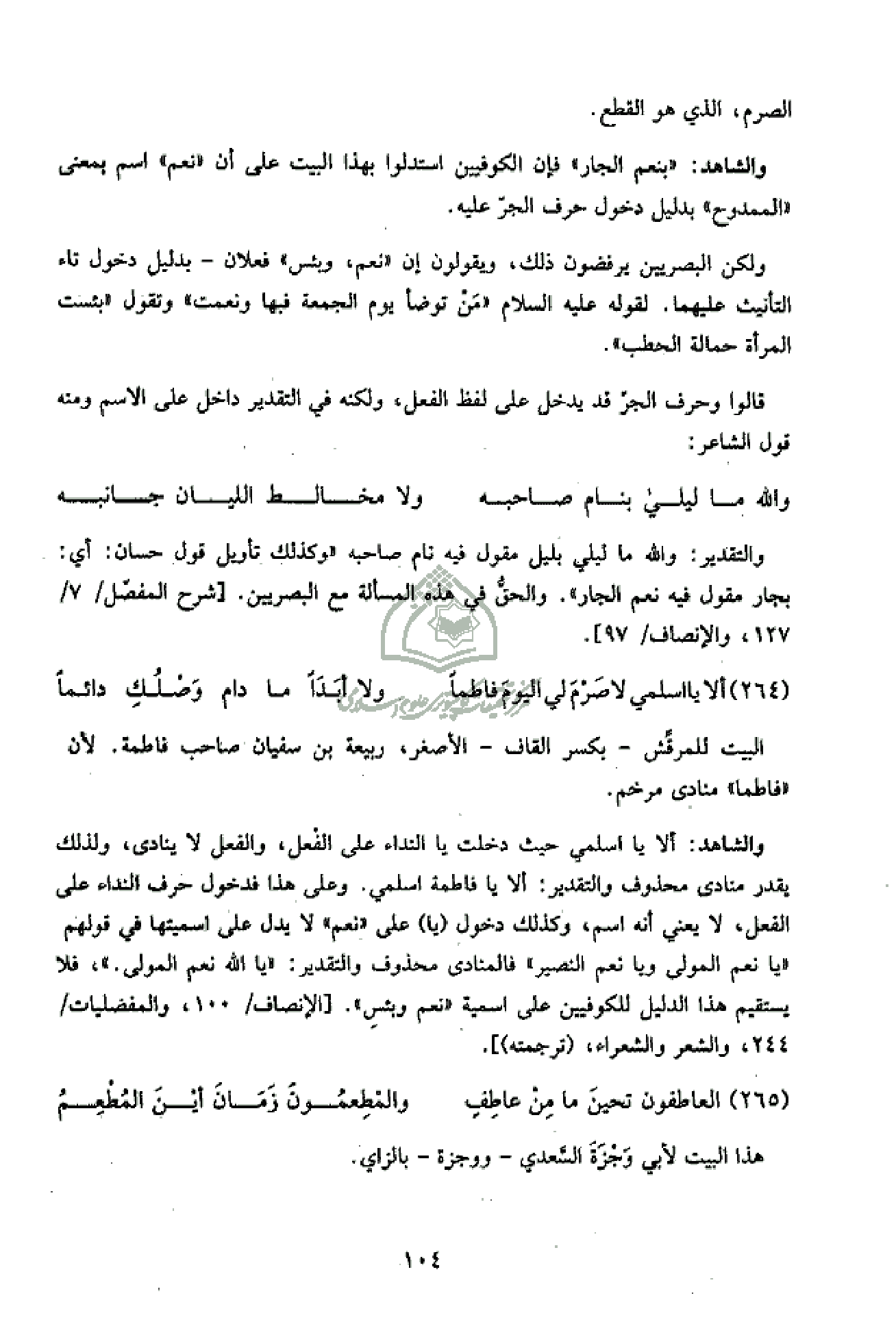 والشاهد: ألا يا اسلمي حيث دخلت يا النداء على الفعل، والفعل لا ينادى، ولذلك يقدر منادى محذوف والتقدير: ألا يا فاطمة اسلمي. وعلى هذا فدخول حرف النداء على الفعل، لا يعني أنه اسم، وكذلك دخول (يا) على «نعم» لا يدل على اسميتها في قولهم «يا نعم المولى ويا نعم النصير» فالمنادى محذوف والتقدير: «يا الله نعم المولى.»، فلا يستقيم هذا الدليل للكوفيين على اسمية «نعم وبئس». [الإنصاف/ 100، والمفضليات/ 244، والشعر والشعراء، (ترجمته)].