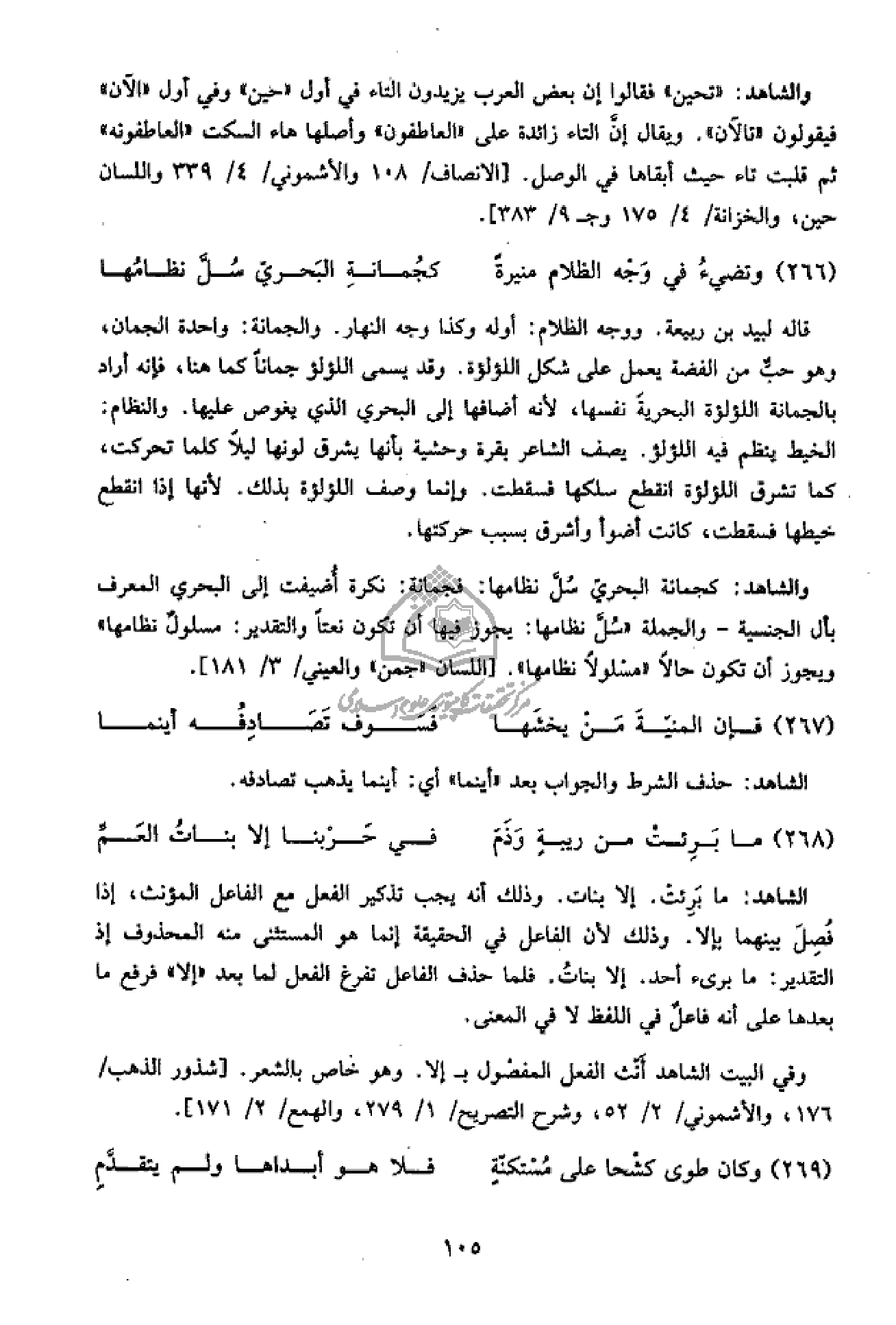 والشاهد: كجمانة البحريّ سلّ نظامها: فجمانة: نكرة أضيفت إلى البحري المعرف بأل الجنسية - والجملة «سلّ نظامها: يجوز فيها أن تكون نعتا والتقدير: مسلول نظامها» ويجوز أن تكون حالا «مسلو لا نظامها». [اللسان «جمن» والعيني/ 3/ 181].