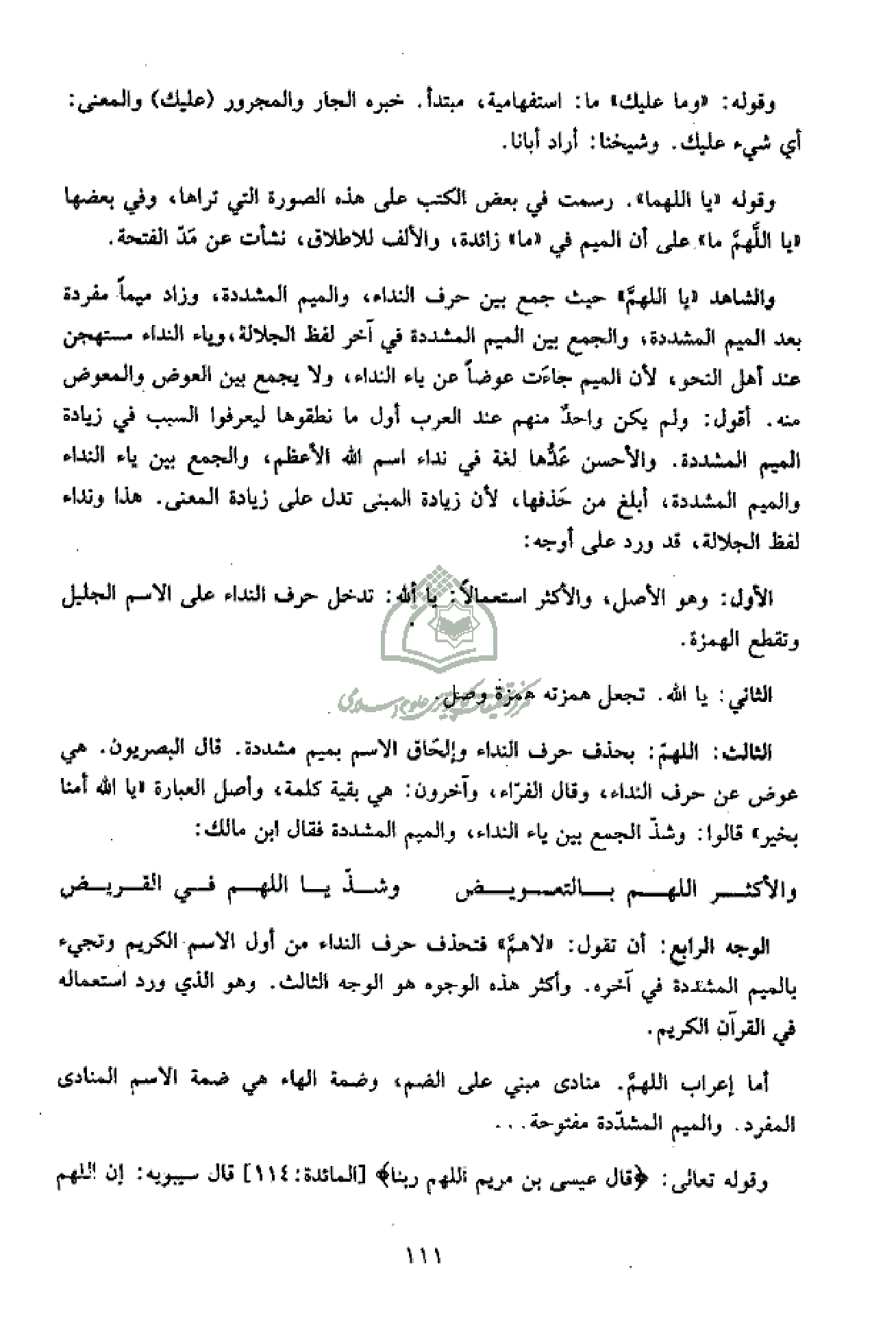 والشاهد «يا اللهمّ» حيث جمع بين حرف النداء، والميم المشددة، وزاد ميما مفردة بعد الميم المشددة، والجمع بين الميم المشددة في آخر لفظ الجلالة، وياء النداء مستهجن عند أهل النحو، لأن الميم جاءت عوضا عن ياء النداء، ولا يجمع بين العوض والمعوض منه. أقول: ولم يكن واحد منهم عند العرب أول ما نطقوها ليعرفوا السبب في زيادة الميم المشددة. والأحسن عدّها لغة في نداء اسم الله الأعظم، والجمع بين ياء النداء والميم المشددة، أبلغ من حذفها، لأن زيادة المبنى تدل على زيادة المعنى. هذا ونداء لفظ الجلالة، قد ورد على أوجه: