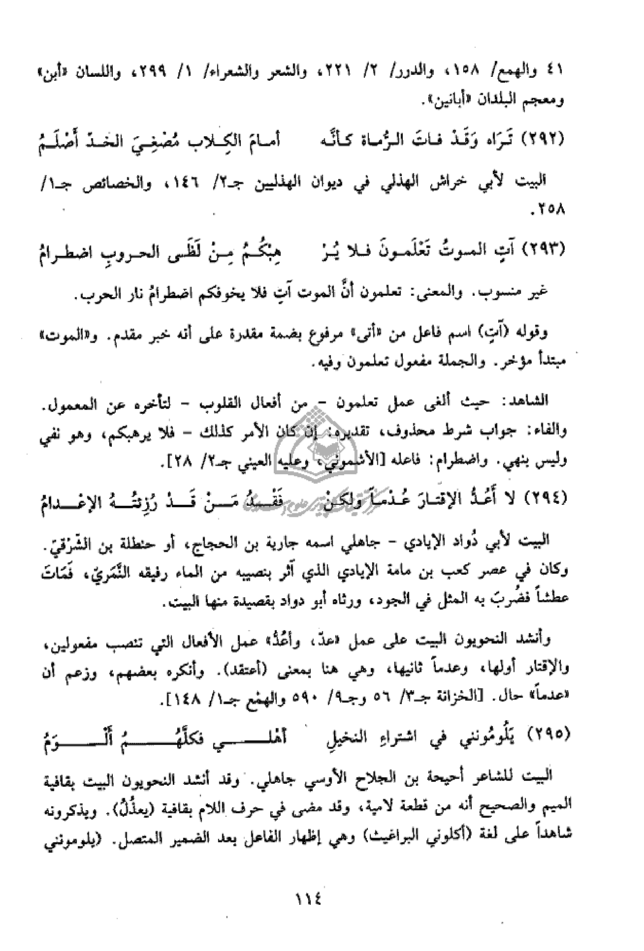 وأنشد النحويون البيت على عمل «عدّ، وأعدّ» عمل الأفعال التي تنصب مفعولين، والإقتار أولها، وعدما ثانيها، وهي هنا بمعنى (أعتقد). وأنكره بعضهم، وزعم أن «عدما» حال. [الخزانة ج 3/ 56 وج 9/ 590 والهمع ج 1/ 148].
