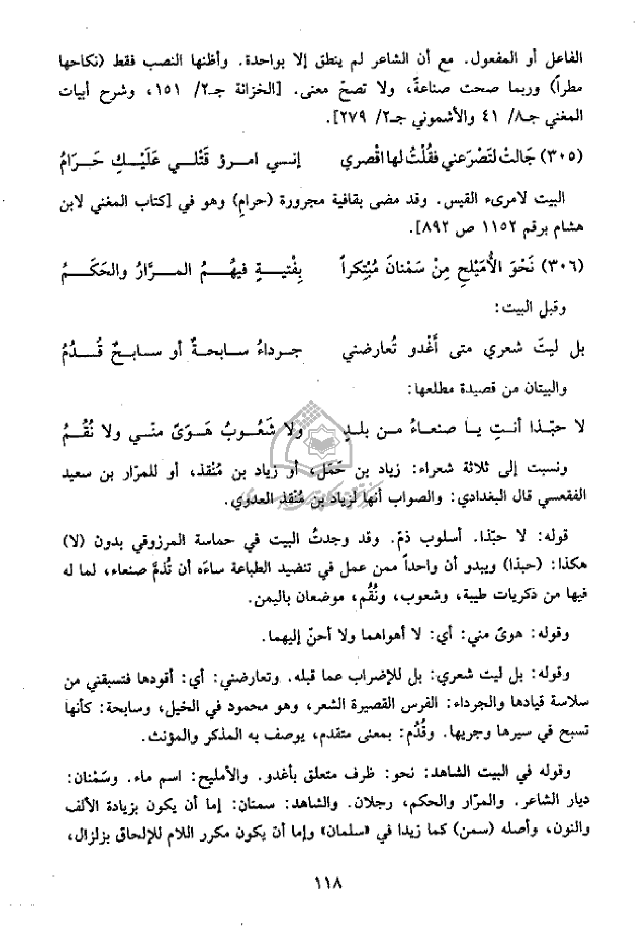 ديار الشاعر. والمرّار والحكم، رجلان. والشاهد: سمنان: إما أن يكون بزيادة الألف والنون، وأصله (سمن) كما زيدا في «سلمان» وإما أن يكون مكرر اللام للإلحاق بزلزال،