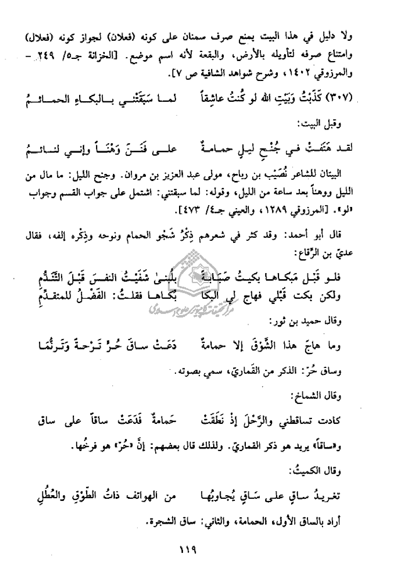 قال أبو أحمد: وقد كثر في شعرهم ذكر شجو الحمام ونوحه وذكره إلفه، فقال عديّ بن الرّقاع: