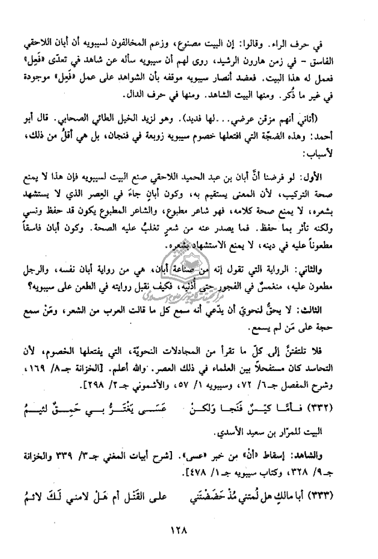 الأول: لو فرضنا أنّ أبان بن عبد الحميد اللاحقي صنع البيت لسيبويه فإن هذا لا يمنع صحة التركيب، لأن المعنى يستقيم به، وكون أبان جاء في العصر الذي لا يستشهد بشعره، لا يمنع صحة كلامه، فهو شاعر مطبوع، والشاعر المطبوع يكون قد حفظ ونسي ولكنه تأثر بما حفظ. فما يصدر عنه من شعر تغلب عليه الصحة. وكون أبان فاسقا مطعونا عليه في دينه، لا يمنع الاستشهاد بشعره.