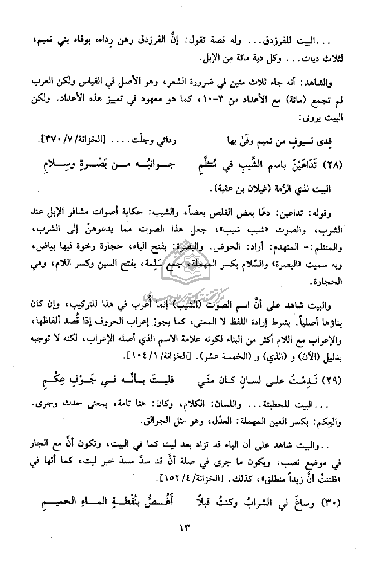 والشاهد: أنه جاء ثلاث مئين في ضرورة الشعر، وهو الأصل في القياس ولكن العرب لم تجمع (مائة) مع الأعداد من 3 - 10، كما هو معهود في تمييز هذه الأعداد. ولكن البيت يروى: