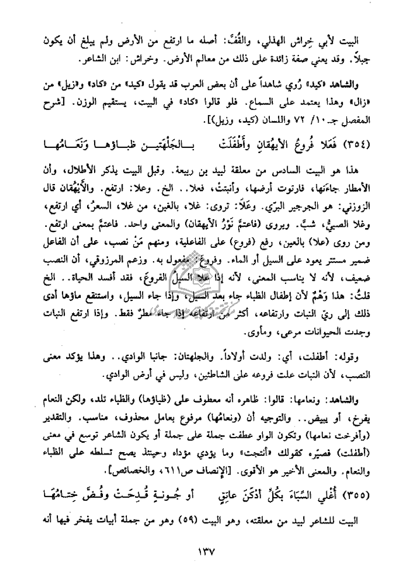 والشاهد: ونعامها: قالوا: ظاهره أنه معطوف على (ظباؤها) والظباء تلد، ولكن النعام يفرخ، أو يبيض .. والتوجيه أن (ونعامها) مرفوع بعامل محذوف، مناسب. والتقدير (وأفرخت نعامها) وتكون الواو عطفت جملة على جملة أو يكون الشاعر توسع في معنى (أطفلت) فصيّره كقولك «أنتجت» وما يؤدي مؤداه وحينئذ يصح تسلطه على الظباء والنعام. والمعنى الأخير هو الأقوى. [الإنصاف ص 611، والخصائص].