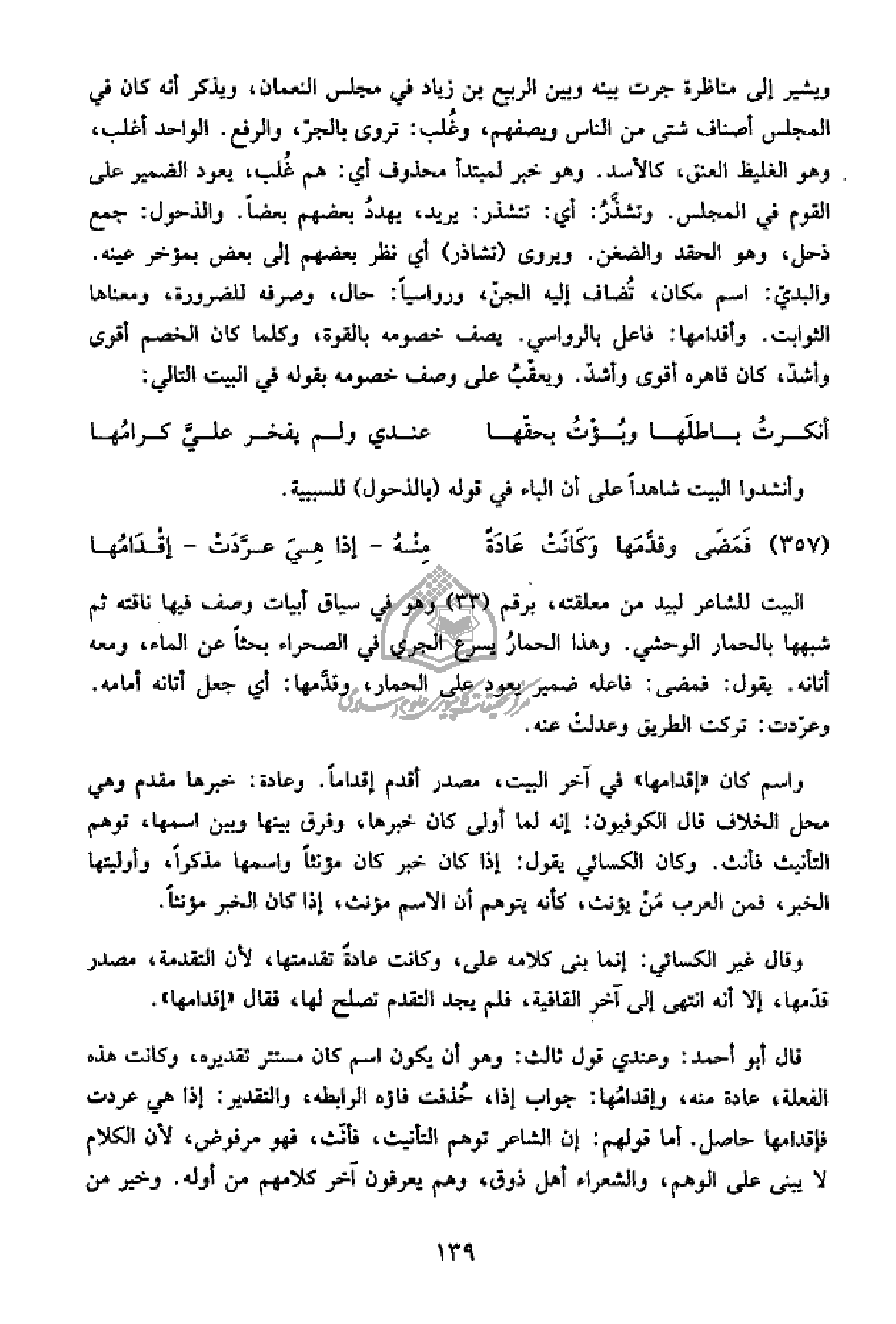 قال أبو أحمد: وعندي قول ثالث: وهو أن يكون اسم كان مستتر تقديره، وكانت هذه الفعلة، عادة منه، وإقدامها: جواب إذا، حذفت فاؤه الرابطه، والتقدير: إذا هي عردت فإقدامها حاصل. أما قولهم: إن الشاعر توهم التأنيث، فأنّث، فهو مرفوض، لأن الكلام لا يبنى على الوهم، والشعراء أهل ذوق، وهم يعرفون آخر كلامهم من أوله. وخير من