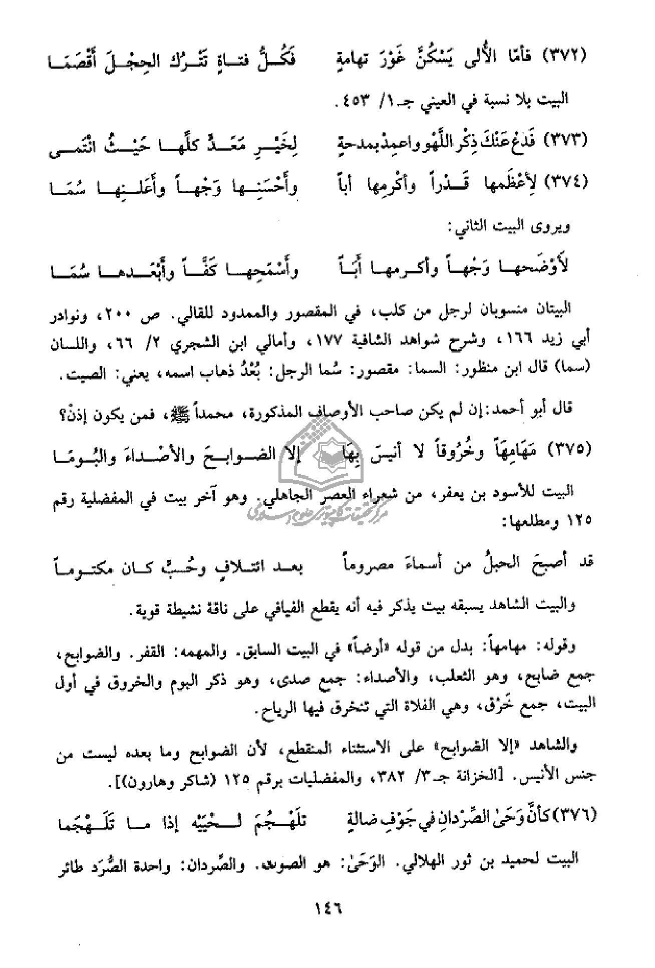 والشاهد «إلا الضوابح» على الاستثناء المنقطع، لأن الضوابح وما بعده ليست من جنس الأنيس. [الخزانة ج 3/ 382، والمفضليات برقم 125 (شاكر وهارون)].
