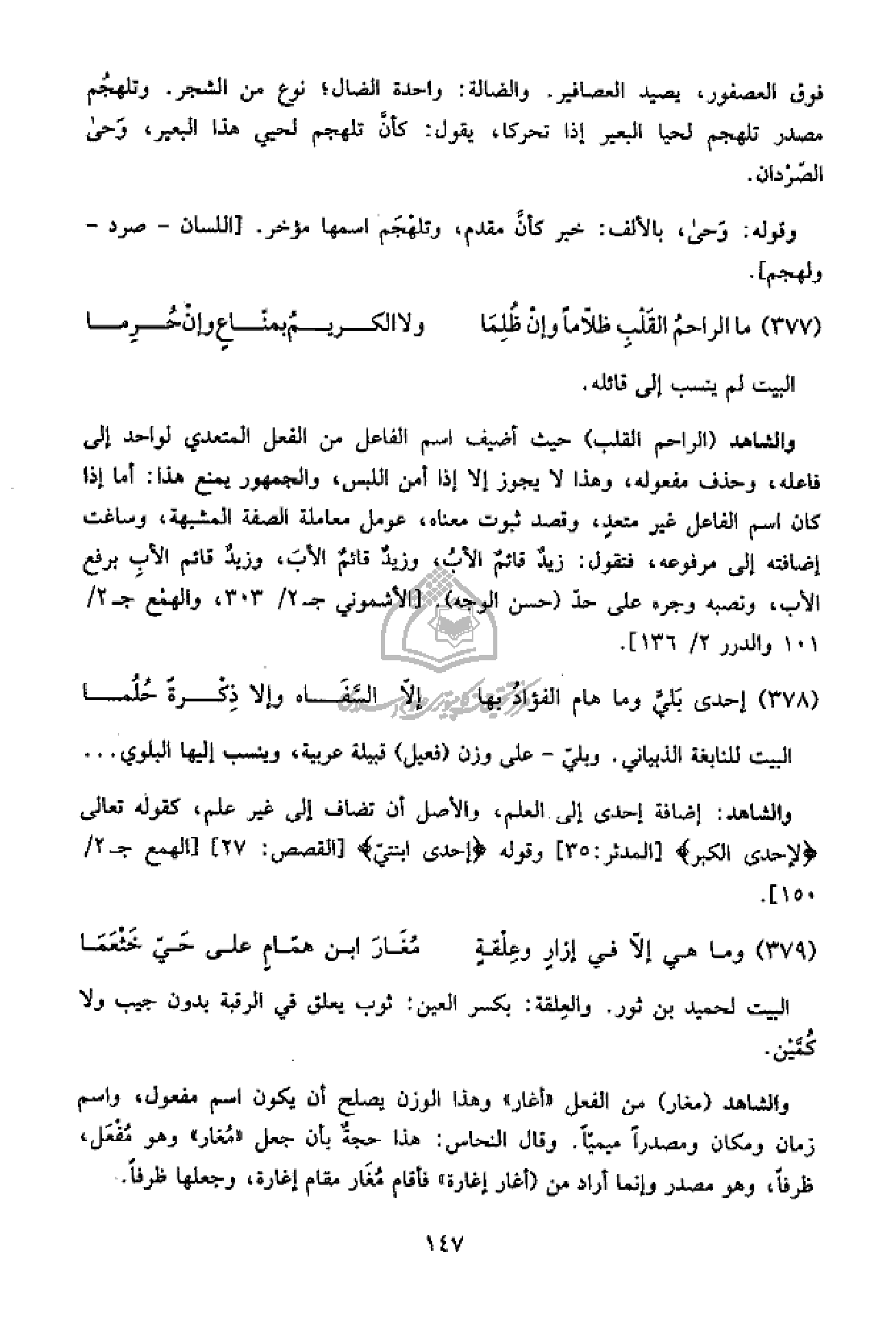 والشاهد (مغار) من الفعل «أغار» وهذا الوزن يصلح أن يكون اسم مفعول، واسم زمان ومكان ومصدرا ميميّا. وقال النحاس: هذا حجة بأن جعل «مغار» وهو مفعل، ظرفا، وهو مصدر وإنما أراد من (أغار إغارة» فأقام مغار مقام إغارة، وجعلها ظرفا.