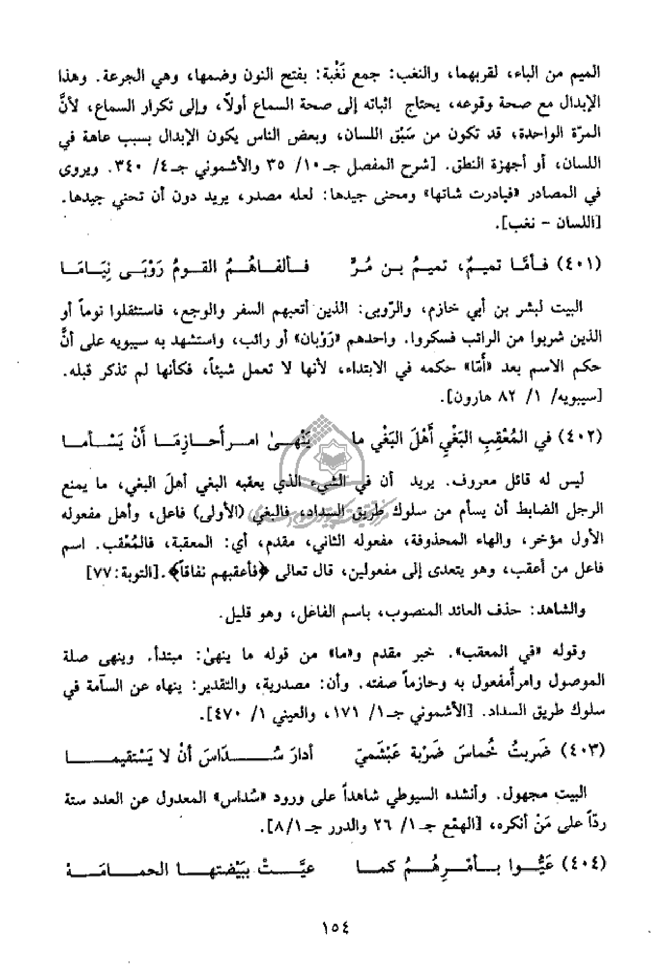 الميم من الباء، لقربهما، والنغب: جمع نغبة: بفتح النون وضمها، وهي الجرعة. وهذا الإبدال مع صحة وقوعه، يحتاج اثباته إلى صحة السماع أولا، وإلى تكرار السماع، لأنّ المرّة الواحدة، قد تكون من سبق اللسان، وبعض الناس يكون الإبدال بسبب عاهة في اللسان، أو أجهزة النطق. [شرح المفصل ج 10/ 35 والأشموني ج 4/ 340. ويروى في المصادر «فبادرت شاتها» ومحنى جيدها: لعله مصدر، يريد دون أن تحني جيدها.