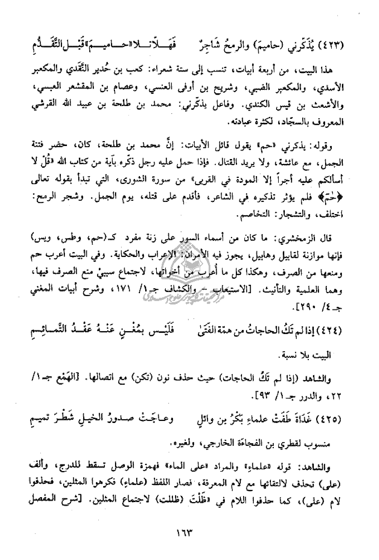 وقوله: يذكرني «حم» يقول قائل الأبيات: إنّ محمد بن طلحة، كان، حضر فتنة الجمل، مع عائشة، ولا يريد القتال. فإذا حمل عليه رجل ذكّره بآية من كتاب الله «قُلْ لا أَسْئَلُكُمْ عَلَيْهِ أَجْراً إِلَّا الْمَوَدَّةَ فِي الْقُرْبى» من سورة الشورى، التي تبدأ بقوله تعالى حم فلم يؤثر تذكيره في الشاعر، فأقدم على قتله، يوم الجمل. وشجر الرمح: