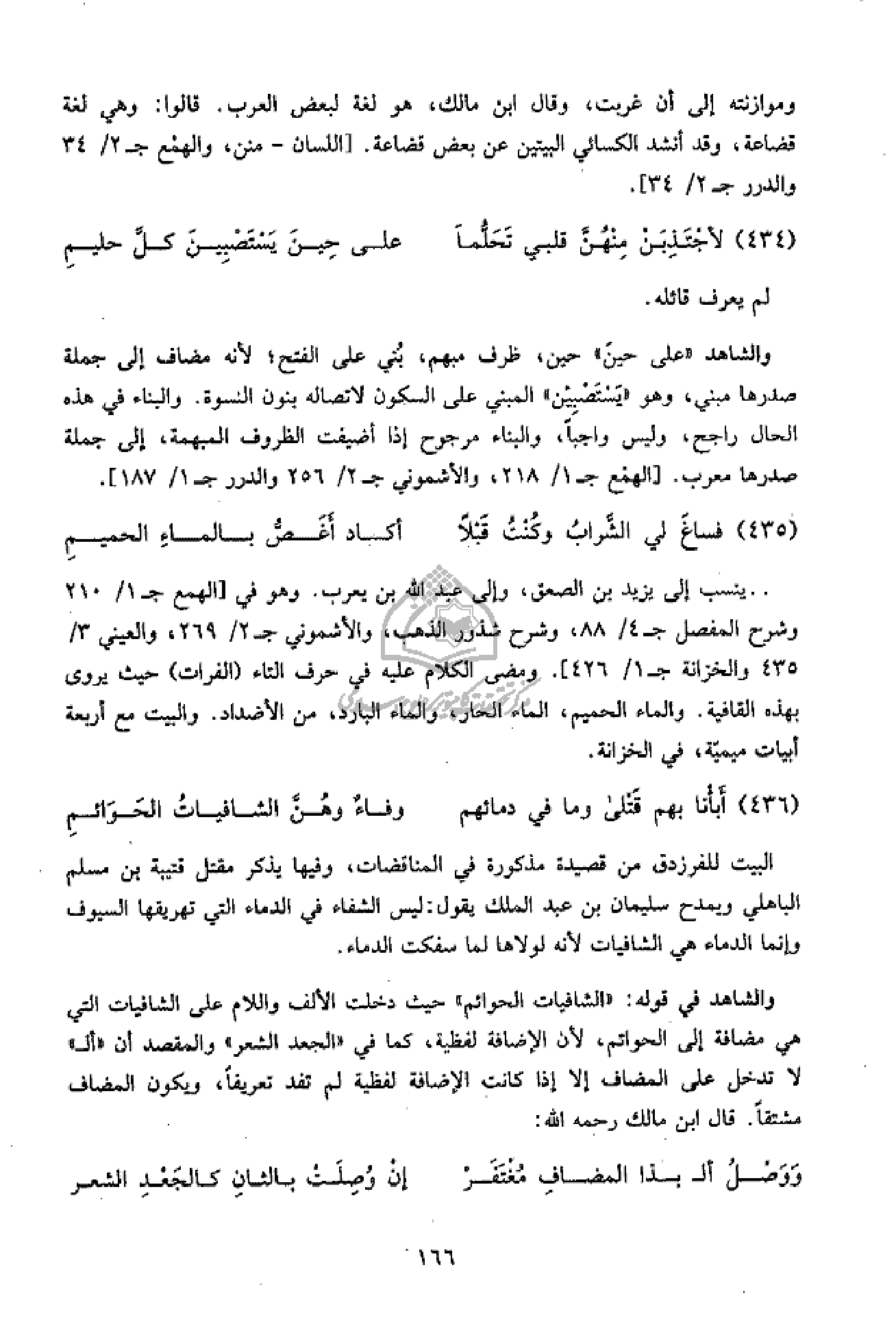 والشاهد في قوله: «الشافيات الحوائم» حيث دخلت الألف واللام على الشافيات التي هي مضافة إلى الحوائم، لأن الإضافة لفظية، كما في «الجعد الشعر» والمقصد أن «أل» لا تدخل على المضاف إلا إذا كانت الإضافة لفظية لم تفد تعريفا، ويكون المضاف مشتقا. قال ابن مالك رحمه الله: