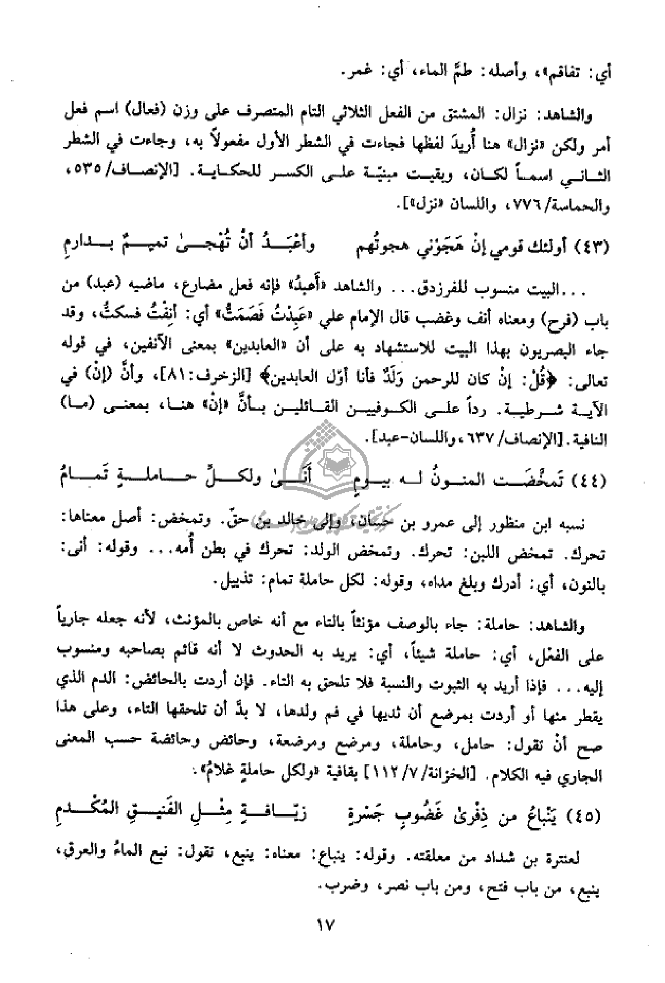 والشاهد: نزال: المشتق من الفعل الثلاثي التام المتصرف على وزن (فعال) اسم فعل أمر ولكن «نزال» هنا أريد لفظها فجاءت في الشطر الأول مفعولا به، وجاءت في الشطر الثاني اسما لكان، وبقيت مبنيّة على الكسر للحكاية. [الإنصاف/ 535، والحماسة/ 776، واللسان «نزل»].
