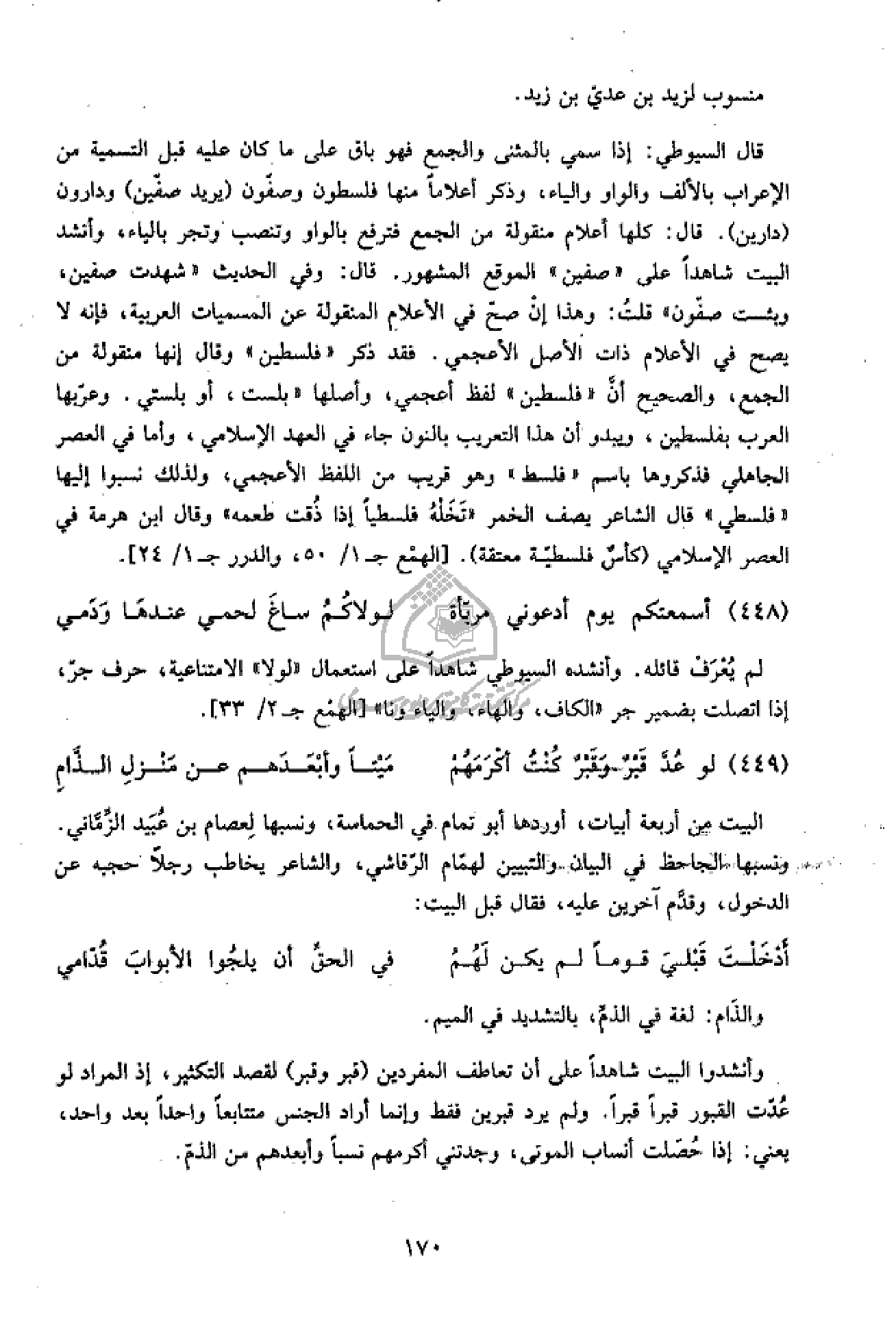 قال السيوطي: إذا سمي بالمثنى والجمع فهو باق على ما كان عليه قبل التسمية من الإعراب بالألف والواو والياء، وذكر أعلاما منها فلسطون وصفّون (يريد صفّين) ودارون (دارين). قال: كلها أعلام منقولة من الجمع فترفع بالواو وتنصب وتجر بالياء، وأنشد البيت شاهدا على «صفين» الموقع المشهور. قال: وفي الحديث «شهدت صفين، وبئست صفّون» قلت: وهذا إن صحّ في الأعلام المنقولة عن المسميات العربية، فإنه لا يصح في الأعلام ذات الأصل الأعجمي. فقد ذكر «فلسطين» وقال إنها منقولة من الجمع، والصحيح أنّ «فلسطين» لفظ أعجمي، وأصلها «بلست، أو بلستي. وعرّبها العرب بفلسطين، ويبدو أن هذا التعريب بالنون جاء في العهد الإسلامي، وأما في العصر الجاهلي فذكروها باسم «فلسط» وهو قريب من اللفظ الأعجمي، ولذلك نسبوا إليها «فلسطي» قال الشاعر يصف الخمر «تخله فلسطيا إذا ذقت طعمه» وقال ابن هرمة في العصر الإسلامي (كأس فلسطيّة معتقة). [الهمع ج 1/ 50، والدرر ج 1/ 24].